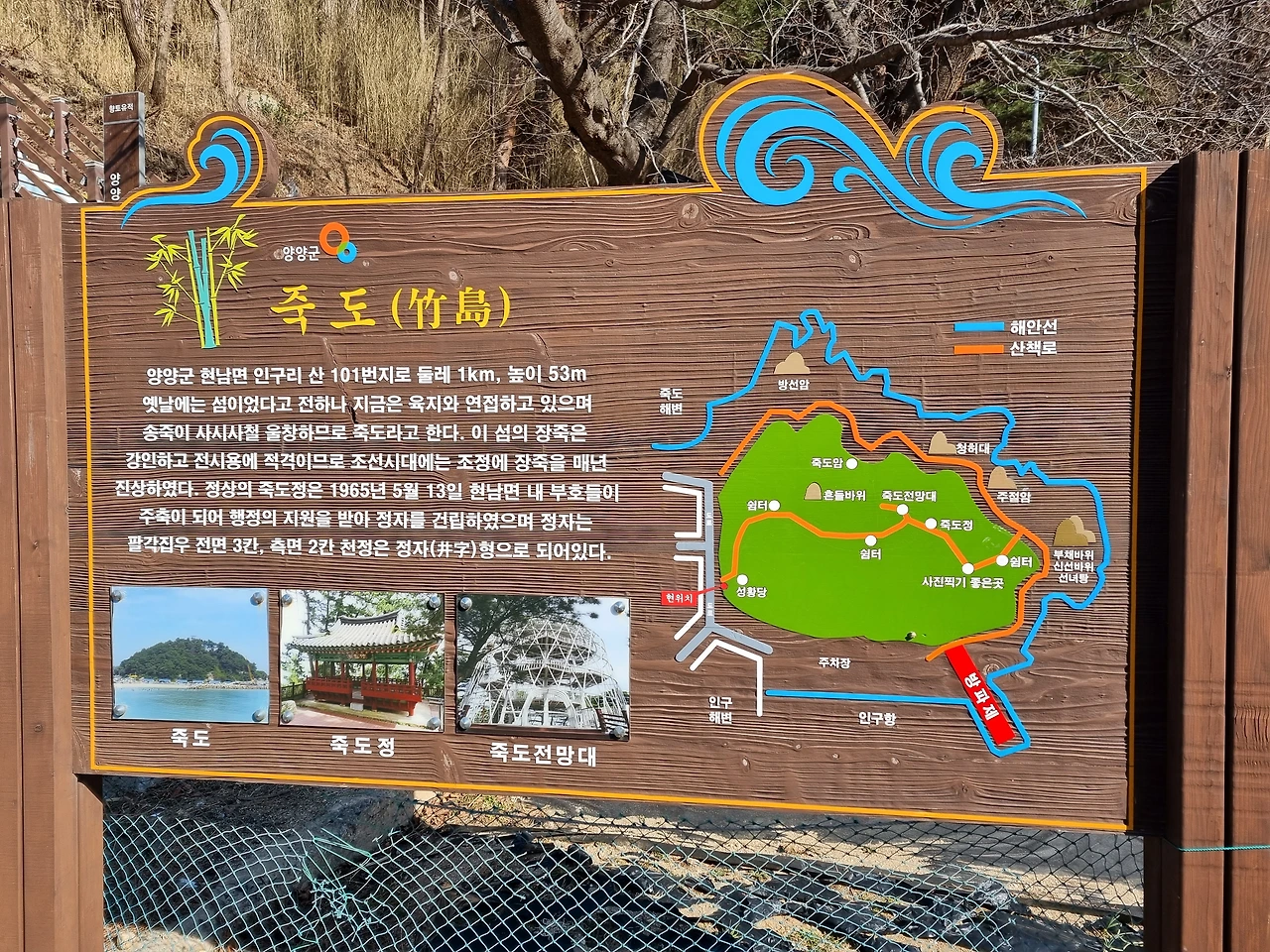 강원도 죽도 중 고성군 죽도는 지난달 다녀왔고, 이번에는 양양군 죽도에 다녀왔다. 현북리 인구항과 연접되어 있는데 백과사전 등에는 섬이라 분류되어 있지만 실질적으로 육지와 연결되어 섬이라 할 수 없다. 그래서 죽도산 방문이라고 하는 사람들도 있다.