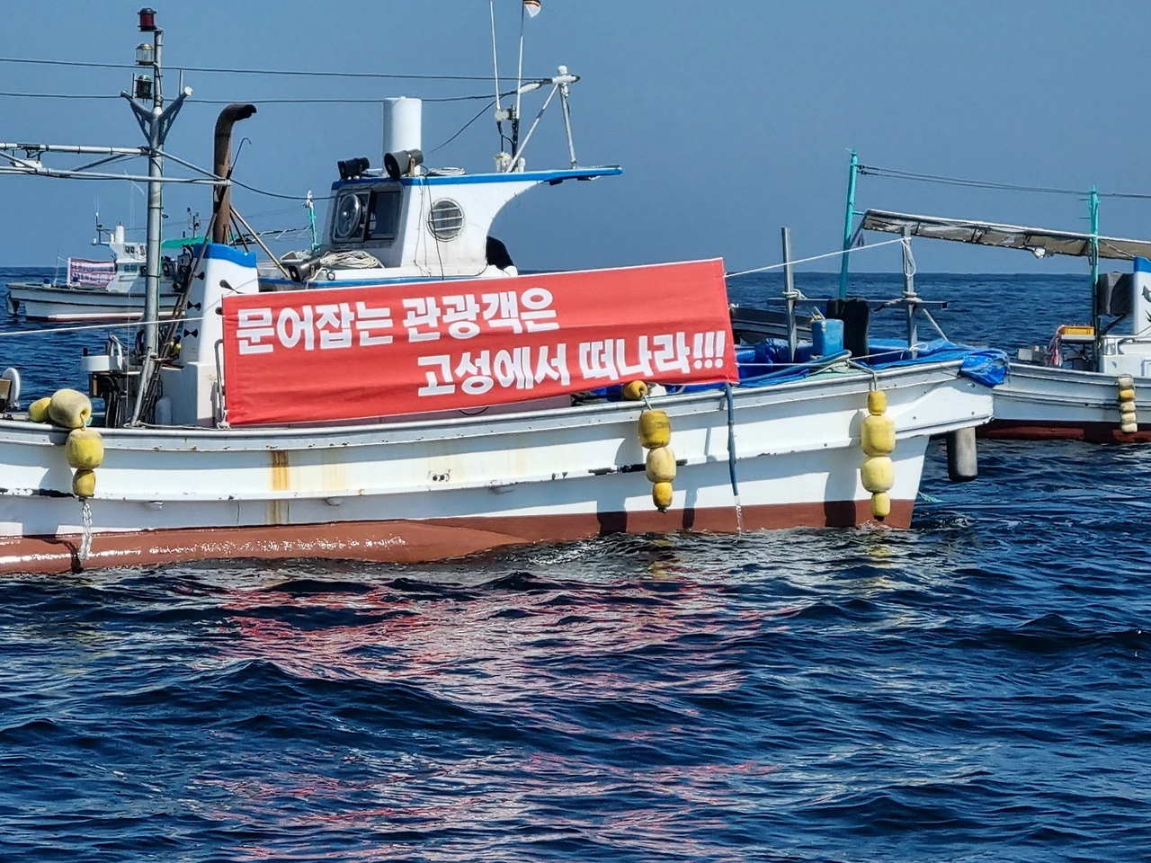 어민들이 문어 낚시 반대 해상시위를 하는 것이다