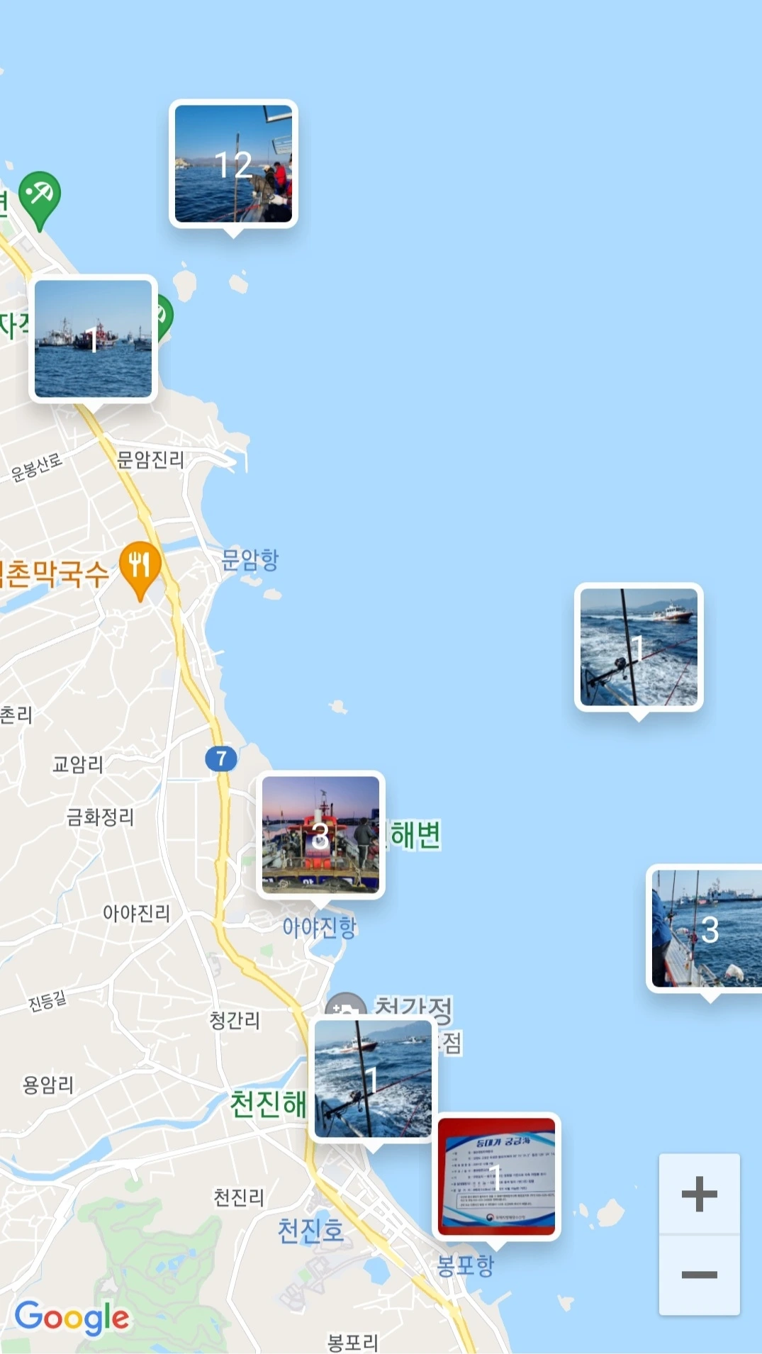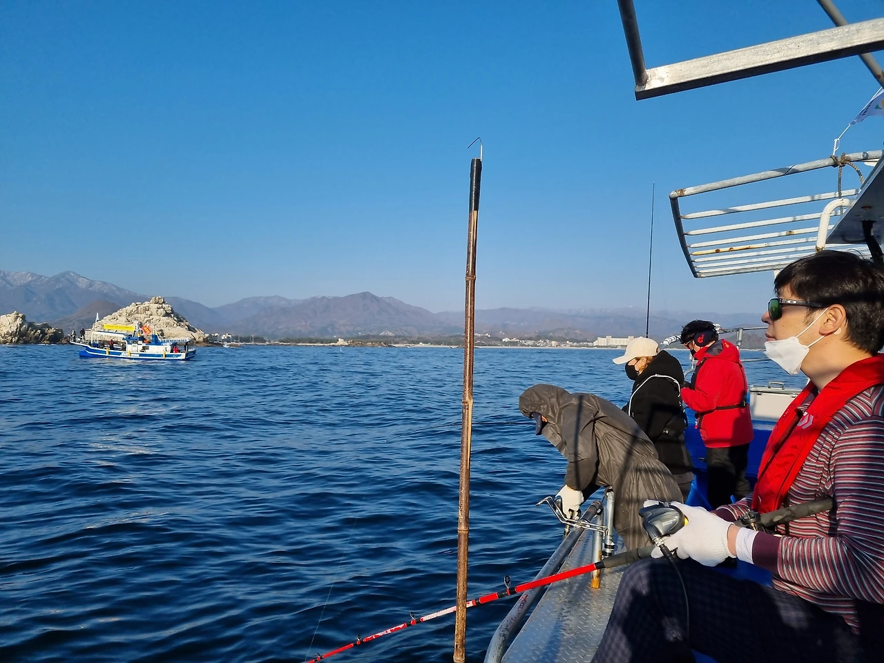 1시간이 넘었는데 내가 속한 좌현 쪽에는 소식이 없다. 이윽고 ‘뚜~뚜’(조업중지 신호). 선장이 뱃머리를 남으로 돌려 새로운 낚시 포인트로 달려간다. 한참을 달려 내려간 곳은 아야진 항과 멀지 않은 곳인데 분위기가 이상하다.