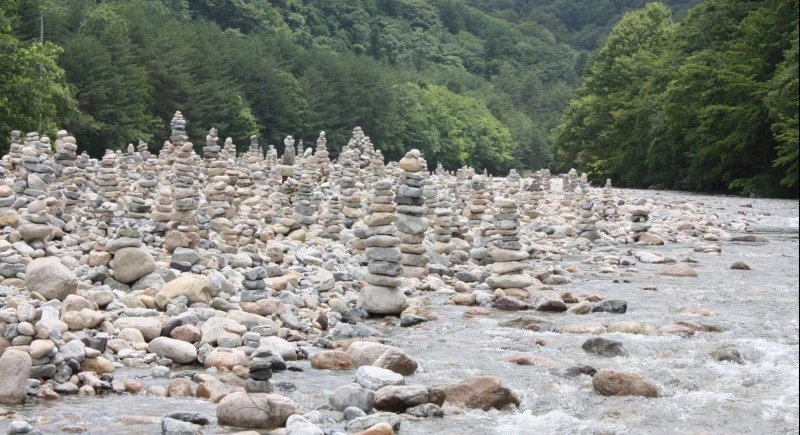 다리 주변에는 수많은 중생들의 염원을 쌓아 놓은 돌탑들이 즐비하다. 한국인들의 돌 탑 쌓기는 유난해 보인다. 모두 종교적 행위라고 단정하기 어렵다. 놀이에 가까운 경우도 많다. 토속문화적 관점에서 바라봐야 하지 않을까?