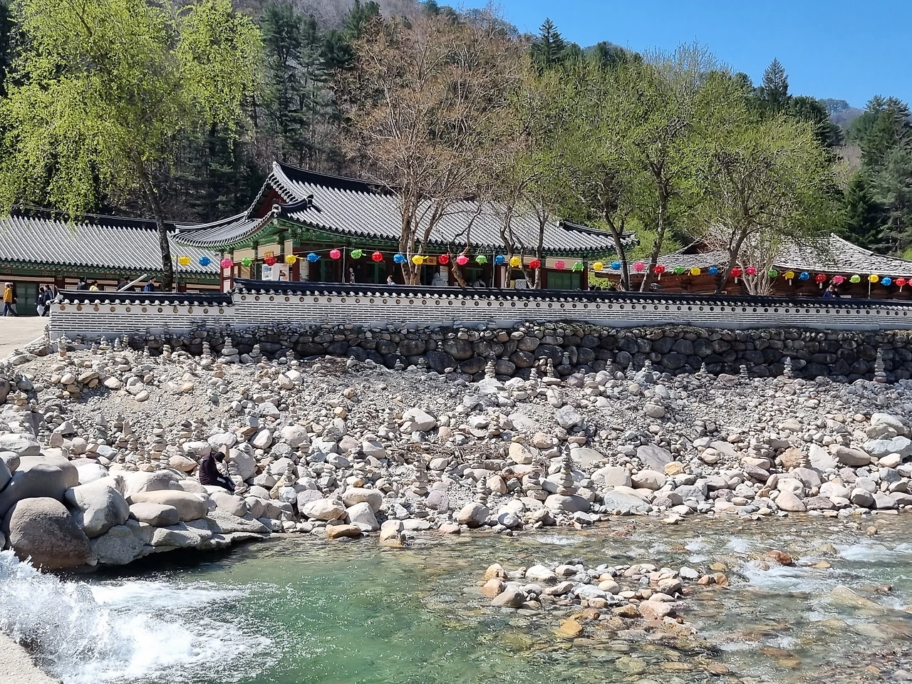 절로 들어가기 위해서 예전에는 징검다리로 건넜었는데 이제는 반듯한 대리석 교량이다. 일주문 자리가 생소한데 절 앞을 지나는 물소리는 낭랑하다. 교량에서 본 절의 모습은 정리정돈이 잘 된 군부대 막사 같다.