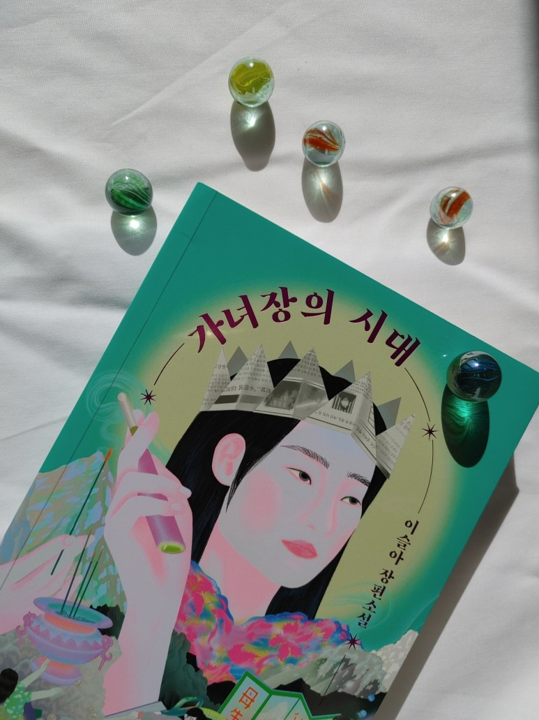 (대체 텍스트, 사진 설명) 흰색 천 위에 책이 오른쪽으로 기울어져 놓여 있다. 책 위에 유리구슬이 네 개, 책 표지 우측 상단에 유리구슬이 한 개 놓여 있다. 햇빛이 위쪽에서 들어오고 있어서 구슬 아래쪽으로 그림자가 진다. 책 표지는 형광색 톤으로 색이 맞춰져 있다. 표지 가운데 커다랗게 주인공 가녀장의 얼굴이 있다. 가녀장은 신문지로 만든 관을 쓰고, 꽃무늬 옷을 입었고, 길고 까만 머리에 오른손에 전자 담배를 들고 있다. 가녀장의 머리 위에 제목인 '가녀장의 시대'가 있고, 얼굴 오른쪽으로 '이슬아 장편소설'이 쓰여 있다. 가녀장 얼굴 아래에는 향이 피워진 향로와 배추 치마를 입고 있는 여성이 있다. '모생아신 부국오신'이 쓰인 병풍도 살짝 보인다. 책 표지 우측 하단에는 출판사 이야기장수가 쓰여 있다.