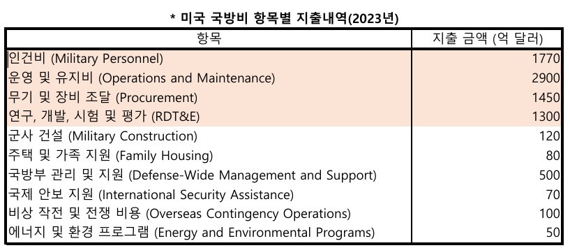 2023년 미국 국방비 지출 내역을 보면 운영 및 유지비로 2900억달러가 지출됐다. 군사 장비와 시설의 유지보수, 훈련, 일상적인 운영 비용 등을 포함한다.