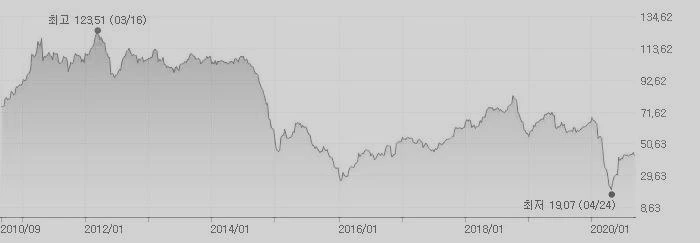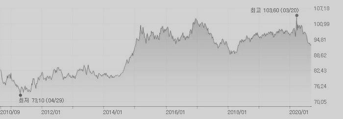 달러 가격(인덱스) 10년 추이와 유가(WTI) 10년 추이다. 둘 중 하나를 뒤집어 다른 하나에 포개면 대체로 일치한다. 달러 가격과 유가가 반비례 한다는 의미다.