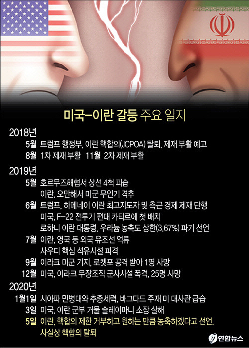 트럼프는 취임 직후 오바마 전 정부가 체결한 미-이란 핵협정을 무참히 파기했다. 이로부터 증폭된 미-이란간 갈등은 급기야 2019년부터 크고작은 물리적 충돌로 이어졌다. 5~8월 노르웨이와 일본 상선이 공격을 받았고, 미국이 이란이 서로의 상대의 드론을 격추했다. 영국의 유조선이 어뢰 공격을 받았다. 미국은 즉시 이 또한 이란의 소행이라고 주장했고, 영국은 보복으로 이란 유조선을 억류했다. 이를 이란이 영국 유조선을 억류하는 등 눈엔 눈 이엔 이 식으로 맞서면서 전쟁 직전 상황까지 갈등이 악화됐다. 12월엔 이라크 친이란계 민병대가 미군기지를 공격, 미국인 1명이 사망했다. 미군이 이에 대한 보복으로 친이란계 민병대 카타이브 헤즈볼라를 공습했다.