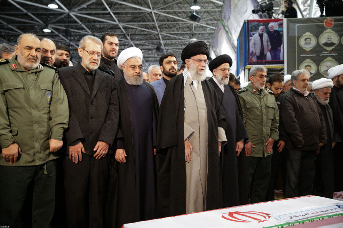 미국의 드론 공격에 폭사한 솔레이마니 관 앞에서 이란 최고지도자 하메네이(왼쪽 네번째) 등이 기도하고 있다.