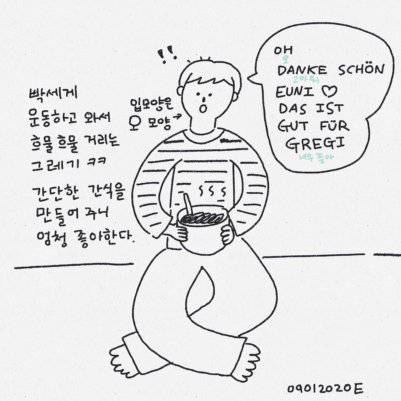 그레기는 항상 운동을 몰아서 하는 경향이 있는데 이 날도 오랜만에 다른 바이커들과 좋아하는 산악자전거를 타고 왔다. 오랜만의 산악자전거라서 집으로 다시 돌아왔을 때 너무 힘들어서 거의 쓰러질 듯한 모습으로 왔는데 그 모습은 항상 재밌다. 그리고 씻고 나서 회색 소파에 누워 담요를 목까지 덮고 있는 모습은 너무 웃기다. (ㅋㅋ)