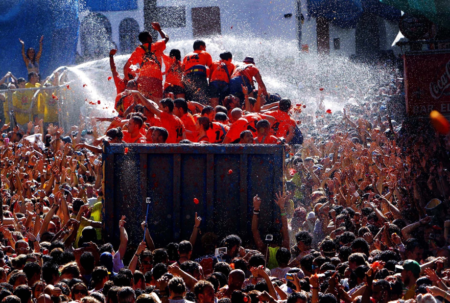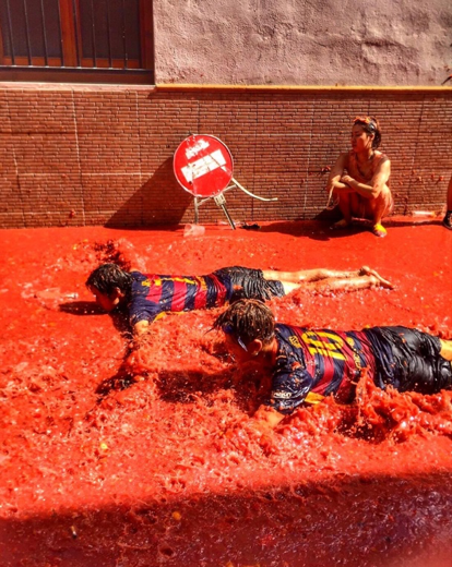 말만으로는 이 유쾌한 아수라장을 제대로 설명하기 어렵다. 처음엔 덩어리가 손에 제법 잡히다가도 이내 현장엔 시뻘건 국물만이 넘쳐흐른다. 안전을 위해 야들야들한 플라스틱 컵에 담아 파는 맥주나 상그리아는 얼른 마셔버리고 그 컵으로 바닥의 걸쭉한 수프를 한가득 퍼담아 때려 붓는 목욕탕 바가지 작전을 써야 한다. 토마토 더미를 말 그대로 산처럼 쌓은 덤프트럭은 전투 와중에도 몇 차례 더 찾아온다. 어떤 트럭엔 토마토와 사람들이 함께 타 있다. 돈 좀 지른 VIP들인가 보다. 트럭 위 토마토 귀족들과 땅 아래 평민들 사이 공성전을 방불케 하는 빠알간 수류탄 수천 개가 허공을 가르며 날아다닌다. 축제가 끝나도 아쉬움에 자리를 뜨지 못하는 무리들은 발목까지 잠기는 토마토 강에서 물장구를 치며 못다 푼 여운을 즐긴다. 역시 온몸을 던져 부대끼는 해방감이 제일이다.