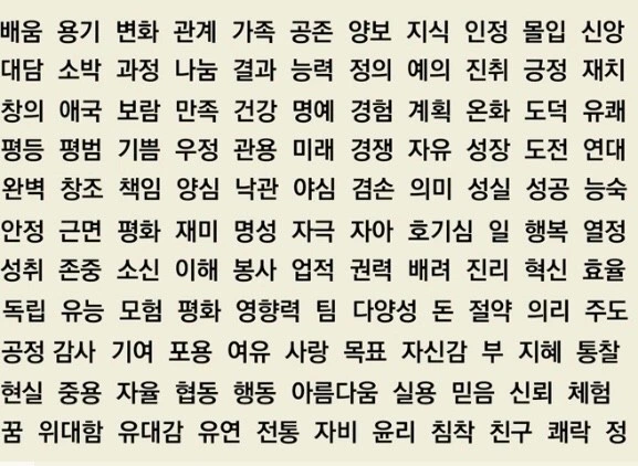 창업을 하려는 이유는 인생의 가치와 비슷하지 않을까? 아래 가치 리스트를 보고 세 가지를 꼽아보면 도움될것이다.