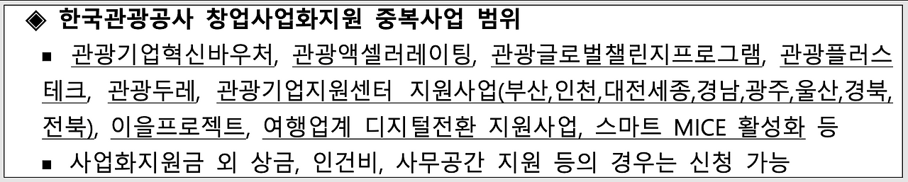 공고문은 자세히 뜯어볼수록 좋습니다. 꽤 쏠쏠한 내용이 많이 담겨있어요. 아래는 관광벤처 공모요강의 일부입니다. 관광벤처는 중복 가능한 지원사업도 친절하게 안내해 줍니다. 관광벤처 이외에도 아래 사업을 함께 알아보면 좋겠죠.