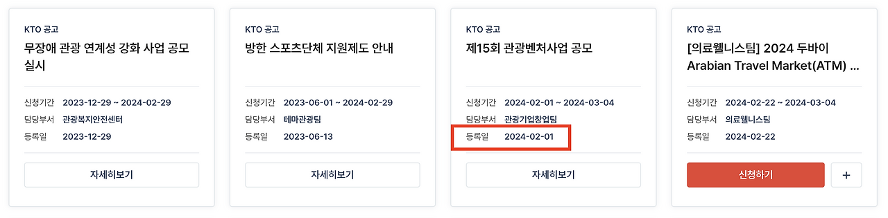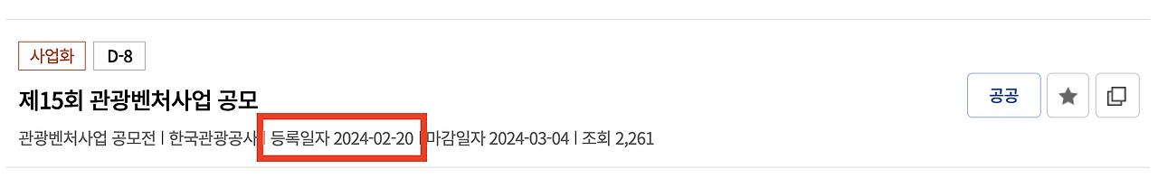 예를 들어 관광벤처공모를 살펴보겠습니다. 관광벤처공모는 한국관광공사에서 운영하는데요. 아래 캡처 이미지는 한국관광공사 > 알림마당 > 공고에 올라온 내용입니다. 2024년 2월 1일에 등록되어 있다고 나와있네요.