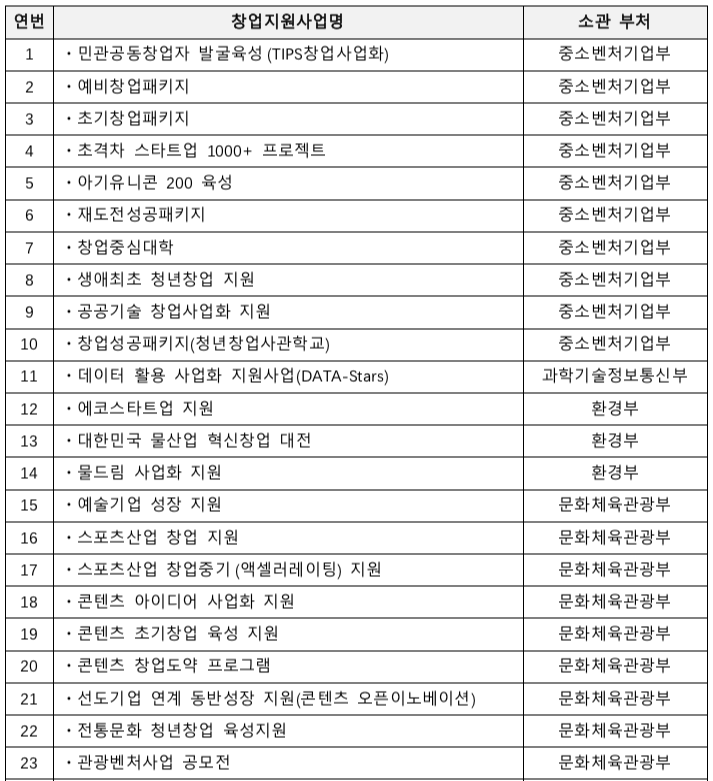 사업 아이템과 관련된 주관기관을 모르겠다면 예비창업패키지 모집공고를 확인해 보세요. 예비창업패키지는 사업자가 없는 사람이라면 누구나 신청할 수 있을 정도로 일반적인 지원사업이죠. 예비창업패키지 모집공고의 가장 하단에는 '동시수행 불가한 창업지원사업 목록'이 있습니다.