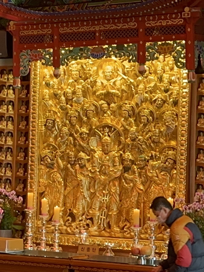 신중단에는 불교의 호법신(붓다의 말을 수호하는 신)을 그려놓은 신중탱이 있다. 신과함께 편에서도 이야기 했듯, 힌두교의 전신 바라문교에서 회의를 느껴 나온 것이 불교여서 힌두교의 많은 신들과 겹치는 부분이 있다. 차이점은 바라문교의 신들은 불교에서 붓다의 말과 세계를 수호하는 수호자들이 되었고 힌두교에서는 붓다가 그들의 신으로 종속되었다. 어찌되었건 바라문교에서 불교로 넘어온 신들은 중앙에 모셔진 붓다보다 위계가 낮은 위치에 있지만 여전히 신의 위치에 있다. 조계종의 경우 보통 예배시간의 마지막에 신중단을 향해 반야심경을 외며 그들도 열반에 세계에 함께 들기를 기도한다.