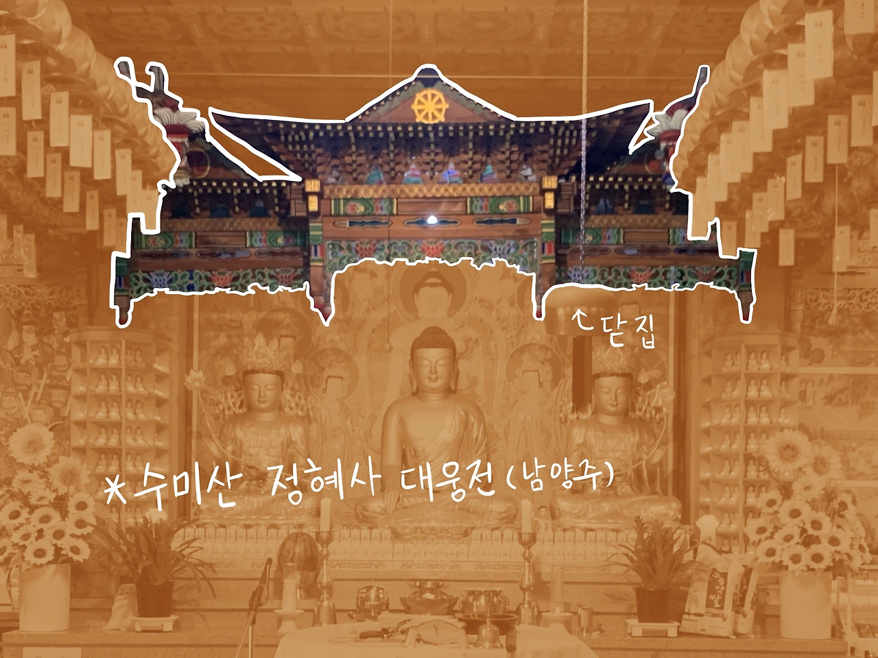 시선을 윗쪽으로 옮기면 불단 위 천장에 집모양의 장식물이 보이는데 이는 ‘닫집’으로 ‘따로 지어놓은 집‘이라는 의미다. 인도에서 불상에 씌워놓은 양산이 중국을 거쳐 집으로 발전한 형태로 보이는데, 이는 근정전 어좌위에서도 발견할 수 있다.