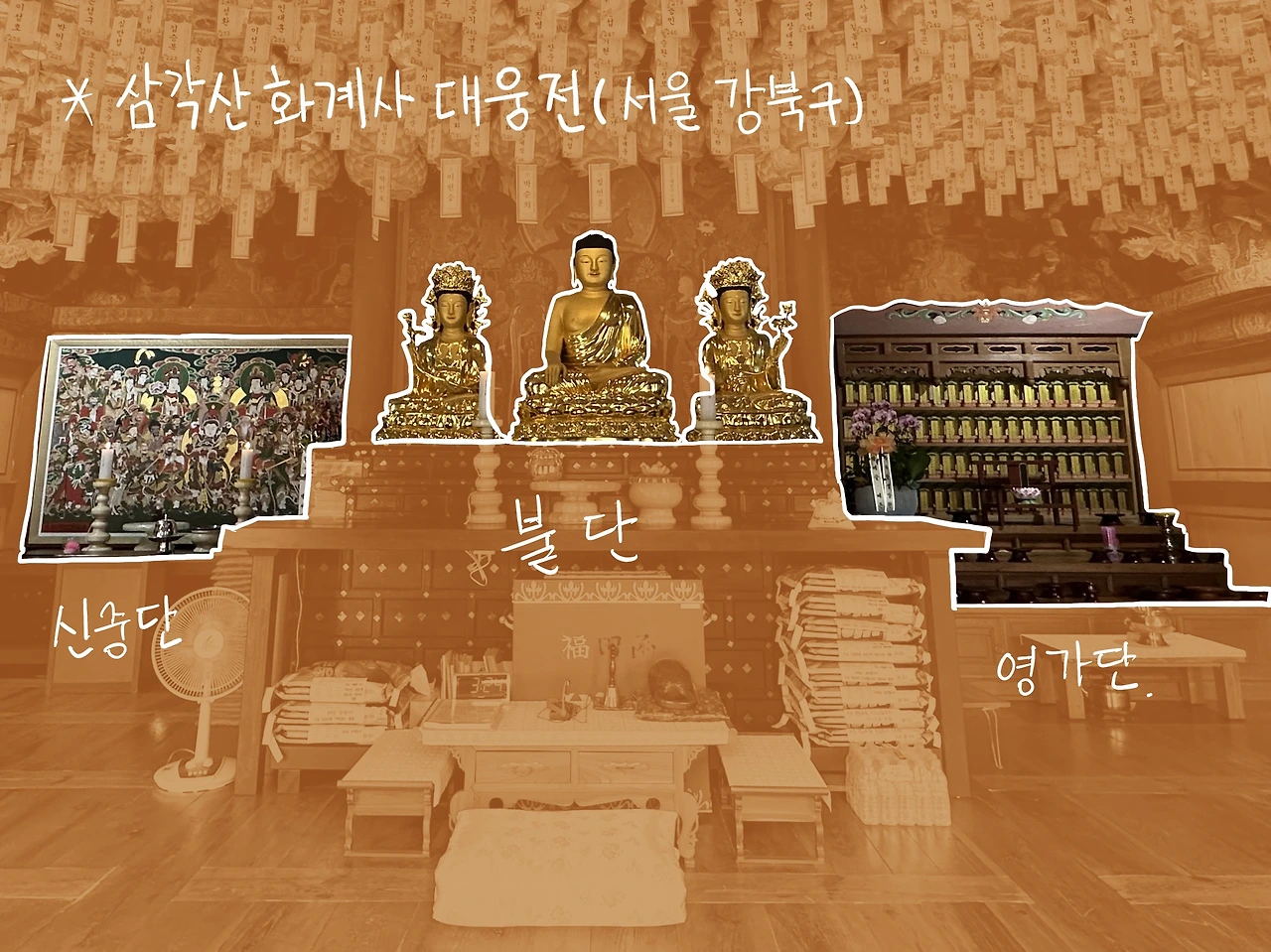 불단의 양쪽엔 불교의 신들을 모신 신중단과 고인의 위패를 모신 영가단이 보인다. 사찰에 따라 서로 위치가 바뀌는 경우도 더러 있다.