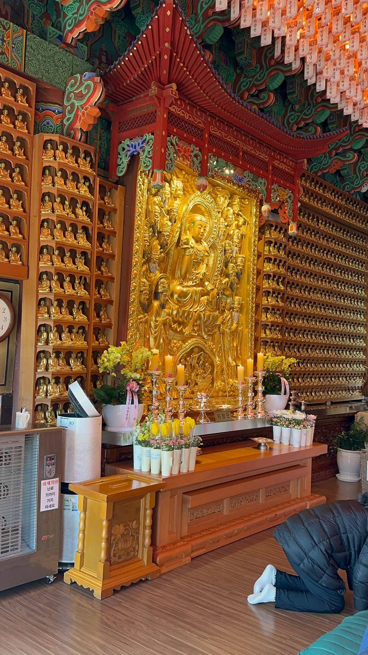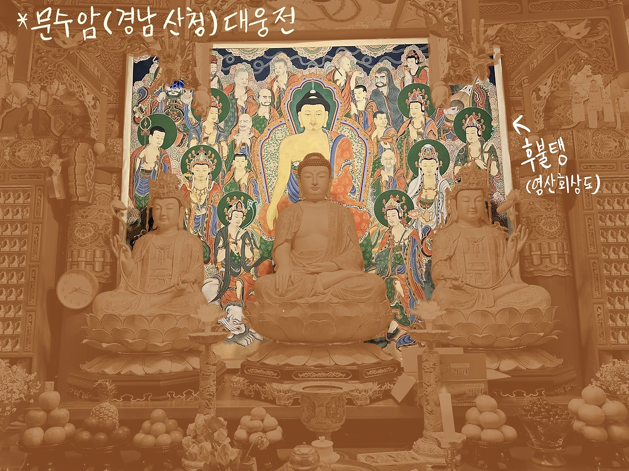 불상 뒤에는 탱이라고 불리우는 불화가 있는데, 삼국시대부터 있었다고 하는 기록이 있다. 주로 경전의 장면들이나 붓다의 설화를 그림으로 묘사한 것들로 지금 읽어도 뜻을 알 수 없는 어려운 불교의 이야기들을 그림으로 풀어주거나 인물의 역할을 설명해주는 용도이다. 이는 중세시대 글을 모르는 사람들을 위해 성당에 그린 종교화 - 예를 들어 시스티나 성당의 천지창조- 등과 같다. 석가모니불이 모셔져 있을 경우는 영산회상도나 팔상도가 후불탱(붓다 뒤에 있는 탱화)으로 걸려있다. 본당이 아니라도 불상이 모셔져 있는 극락전이나 지장전등의 전각도 각 불상의 이야기를 담은 후불탱이 걸려있다. (아는 사람만 잘 보이는 그런…..극강의 화려함과. 디테일이다.)
