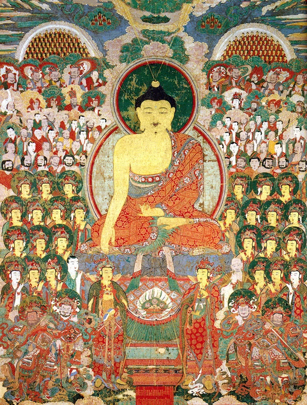 영산회상도의 경우 석가모니가 영축산에서 법화경을 설한 법회를 그린 그림으로 많은 법당이 영산회상도를 뒤에 걸고 있다. 법화경은 40년간의 붓다의 설법이 집약한 정수로 대중의 깨달음을 중요시하는 대승불교에서 경전의 왕으로 취급하는 경전이다. 보통 석가모니를 중심으로 두고 문수, 보현 2명의 보살을 기본으로 짝수로 10명의 보살까지 늘어나며, 그 아래 부처님의 말을 수호하는 호법선신 사천왕을 기준으로 대범천, 제석천, 혹은 조사들이 더해져 그려지기도 한다.