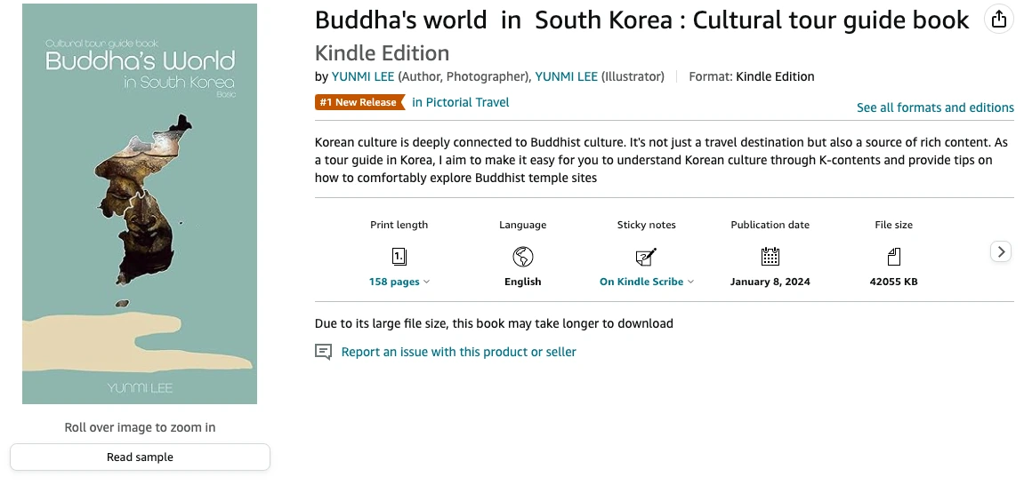 아마존에 풀어놓은지는 한 일주일 정도 되었는데, 그간 사진 여행기 1위를 했더라구요. 사찰을 여행하기 위한 불교기초 지식같은 느낌으로 작성했는데, 다행히도 구매해주신 분들이 계셨어요. 더불어 브런치 페이지의 글과 그림, 사진도 좀 정돈이 되고 있습니다. 한국어판은 브런치보다 좀 더 정돈되고 사진이 많이 들어간 판으로 지금 북크크에서 전자책 출판 예정입니다.