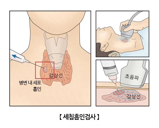 *2. 세침흡인검사(Fine neddle aspiration biopsy): 세침검사라고 간단히 불리며 대략 체취 최대 5분 정도의 시간이 소요된다. 초음파를 보며 의심되는 갑상선 결절을 조직검사용 바늘로 찔러 조직을 얻은 후 양성 혹은 악성을 진단하기 위한 목적으로 시행하는 검사다. 필요시 국소마취를 시행하며 초음파로 양성이 의심되는 곳을 확인한 후 목에 조직검사용 바늘을 삽입하여 조직을 채취한다.