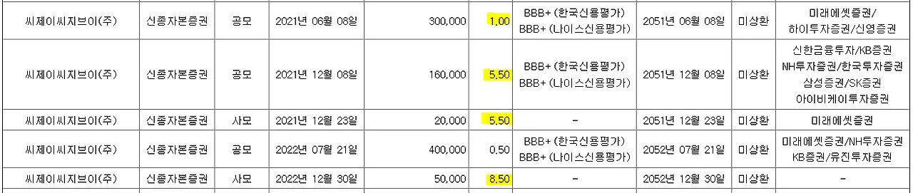 장기인 신종자본증권은 제무재표상 자본으로 인식되기 때문에 부채로 계상되지는 않았지만, 잔액이 거의 1조에 달하는 수준이다. 아래 표에서 미상환된 신종자본증권의 이율을 살펴보면 1%는 문제가 없지만 5.5%, 8.5% 증권은 빨리 갚는 것이 좋다. 안 그러면 높은 금융비용으로 계속 현금을 까먹는 결과를 낳게 된다.
