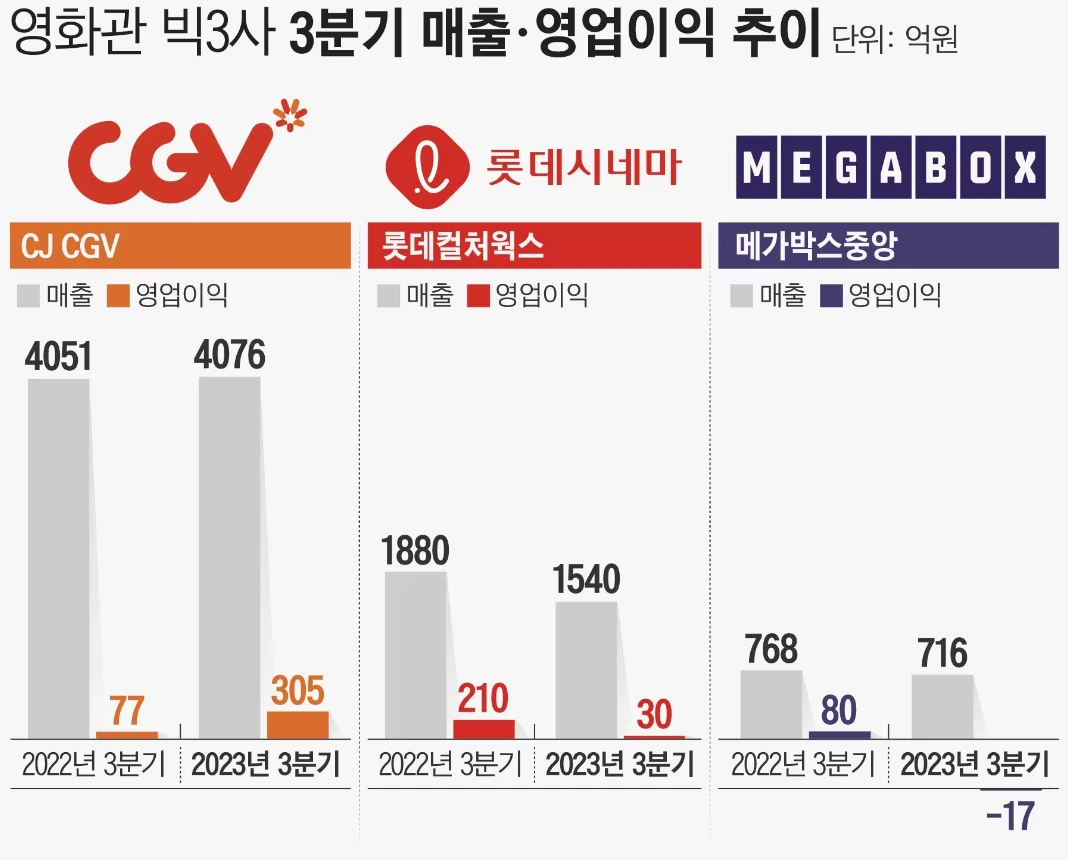 국내 기업들의 2023년 3분기 실적이 발표되었다. 영화관 업계에서는 CGV의 실적이 돋보였다. 롯데컬처웍스와 메가박스는 전년 동분기 대비 매출과 실적이 모두 악화했는데 CGV는 매출은 유지했고 영업이익은 무려 3배 가까이 나왔다.