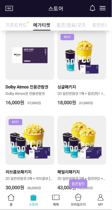 메가박스는 다른 브랜드보다 패키지 구성이 잘 되어있다. 팝콘까지 먹을 경우 패키지를 구매해 보자. 또 돌비시네마 전용관람권과 돌비 애트모스 전용관람권도 할인 판매하니 돌비관에서 관람할 경우 사용해 보도록 하자.