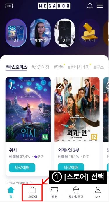 ① 메가박스 앱을 켜고 [스토어]을 선택한다.
