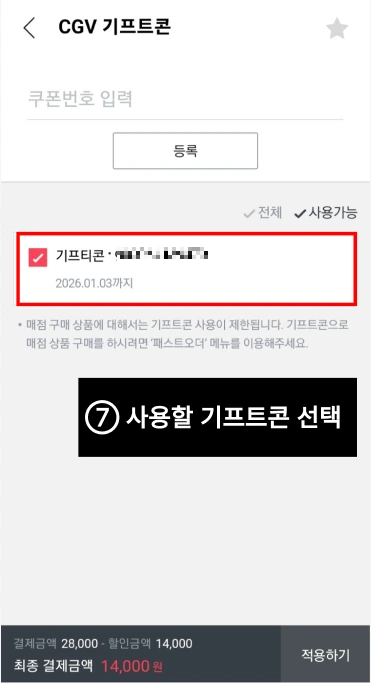 ⑦ 사용할 기프트콘을 선택 후 적용한다.
