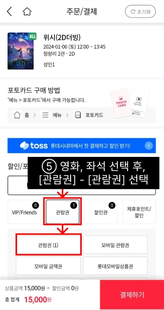 ⑥ 결제단계에서 [관람권]-[관람권]을 선택한다.