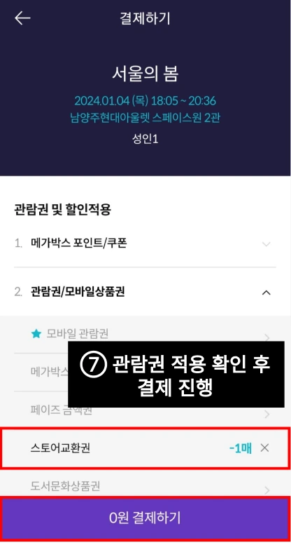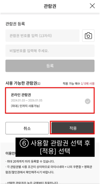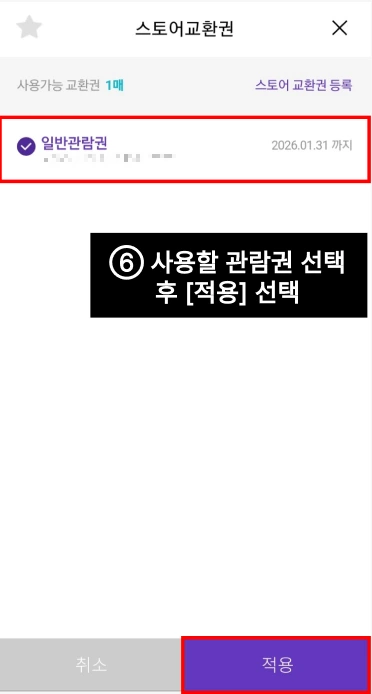 ⑦ 사용할 '관람권'을 선택 후 적용한다.