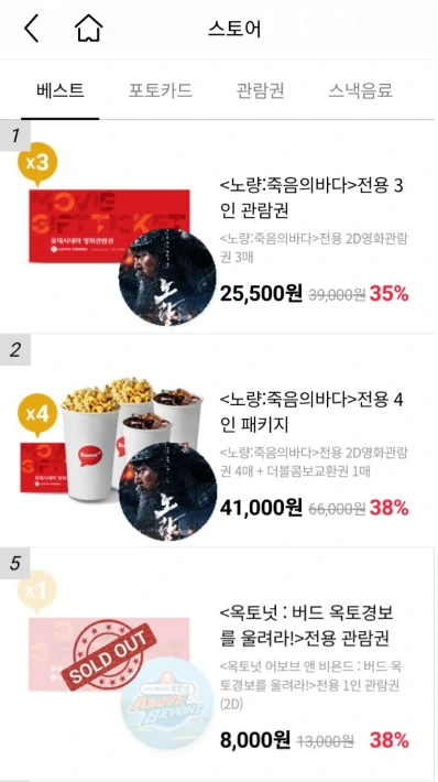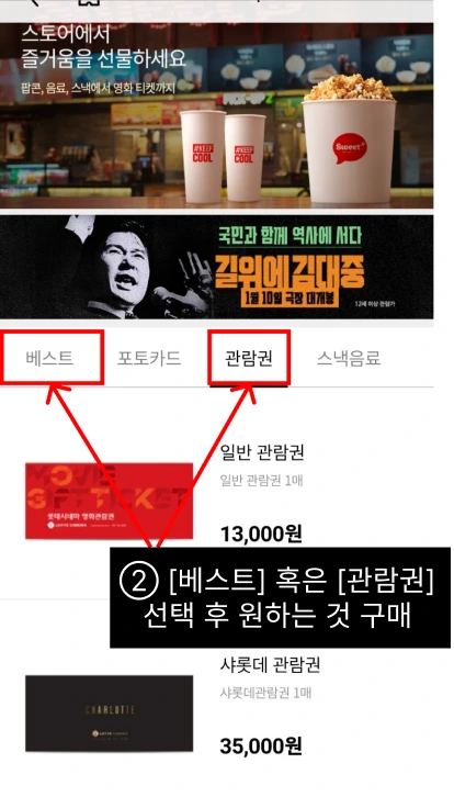 ② 스토어에서 [베스트] 혹은 [영화관람권]을 선택한다.