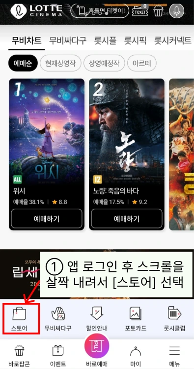 ① 롯데시네마 앱을 켜고 살짝 아래로 내려서 [스토어]를 선택한다.