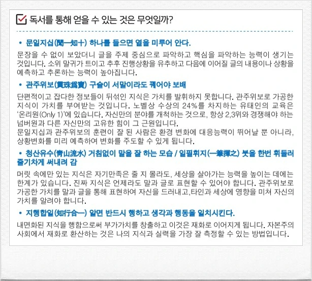 문일지십(하나를 들으면 미루어 열을 안다).글을 수없이 보면, 주제 중심으로 파악하고 핵심을 파악하는 능력이 생긴다. 저자가 하고자 하는 말을 빠르게 파악하게 되고 향후 진행될 상황에 대한 유추와 추론 능력이 좋아진다. 어떤 직업을 갖든, 무슨 일을 하든, 말귀를 잘 알아듣고 상황 파악이 빠르고, 상황의 전개를 예측할 수 있는 사람은 귀한 인재로 평가받는다. 회사의 일원이 되는, 사업을 하든 중요한 능력이 된다.