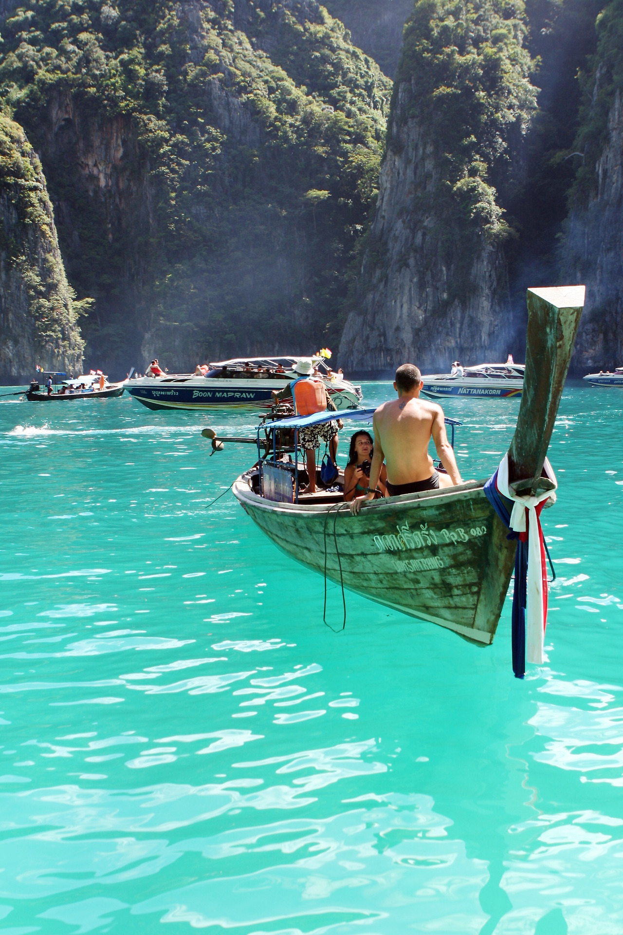 다음날은 스노클링을 하기 위해 다시 피피섬을 향했다. 이번에는 피피레였다. 삐레 만(Pi Leh Lagoon)은 초록빛으로 우거진 수풀 위에 우뚝 솟은 석회암 절벽으로 둘러싸여 있으며, 수십 미터 아래 바닥이 보일 정도로 맑은 에메랄드빛 물이 특징이었다. 투명한 물위에 떠있는 배들이 마치 공중에 걸어놓은 처마 끝 풍경(風磬)처럼 보였고, 당장 바다 아래로 뛰어들고 싶었다.
