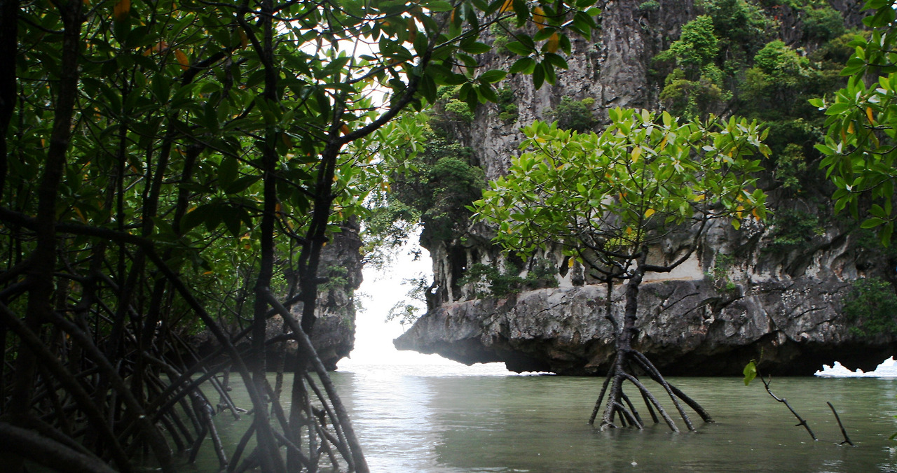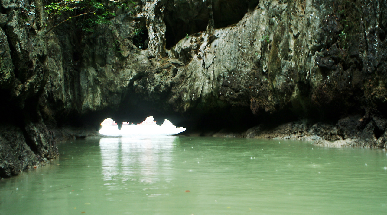 카누에서 손을 뻗으면 천장이 닿을만한 아슬아슬한 수면을 통과하니 섬 한 가운데 커다란 공간이 나온다. 바다와 섬이 만들어낸 거대한 중정(中庭)인양 싶다. 주변으로 많은 나무들이 있었는데, 다들 잘 자라고 있는 게 눈에 띈다. 파도 때문인지 거대한 바위섬의 아랫부분은 안쪽으로 깊이 패여 있었다. 천혜의 관광자원을 갖춘 곳이라는 점을 누구도 부정할 수 없었다.