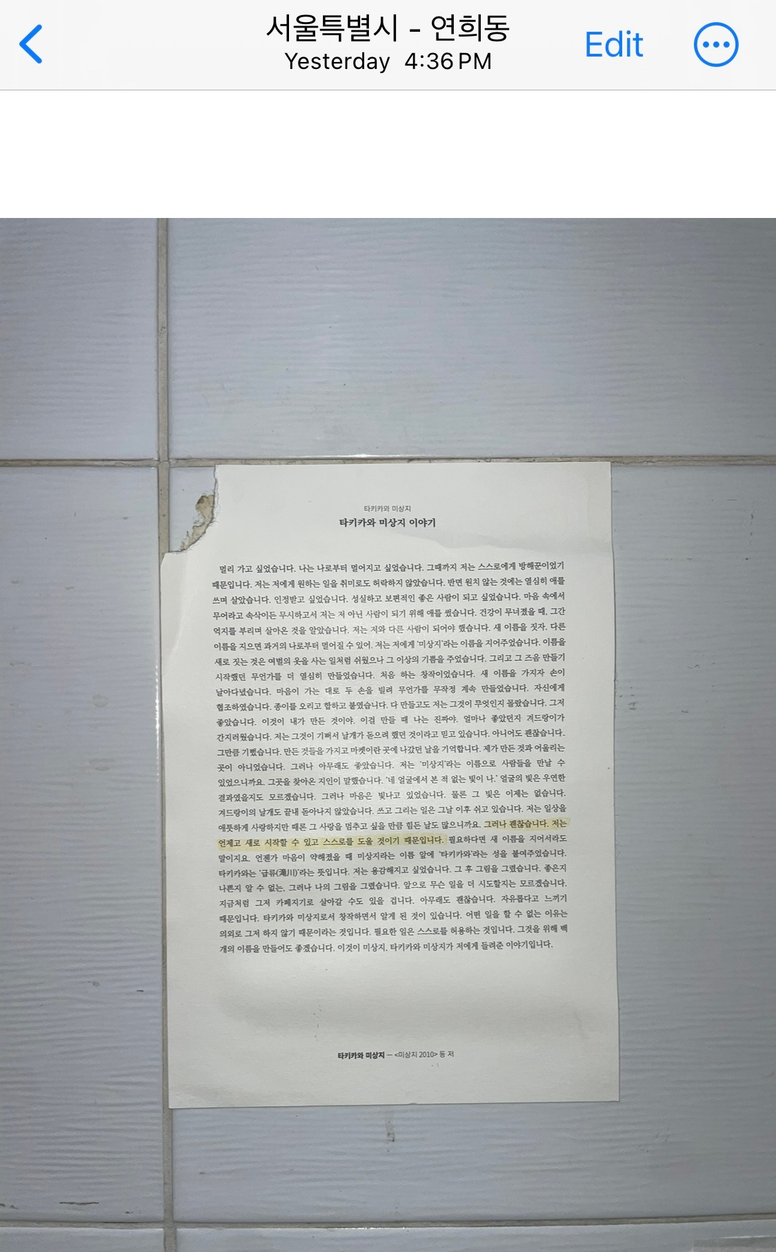 <타키카와 미상지 이야기> 카페에서 글을 쓰다 화장실에 갔더니 이런 글이 붙어있었다. 이제껏 장황하게 늘어놓은, 내가 하고 싶었던 말을 한 페이지에 담은 정갈한 글. 정말로 운명적인 만남이 아닐 수 없다. 몰입해서 살다 보면 고민 중인 문제의 답안지를 볼일을 보다가도 발견할 수 있다. 이런 경험은 해도 해도 여전히 기묘하고 놀랍다. 겹치는 단어와 표현들. 근데 내 문장보다 더 간결하고 나아 보여서 마음을 헤집어 놓는 질투심. 하지만 그마저도 좋다. 좋은 글은 가장 확실한 도파민이다. 아무튼. 썼던 글을 모조리 지우고 이 글을 소개하는 것으로 지면을 할애하는 것이 낫겠다 싶었지만 수고한 나 자신을 생각해서라도 쓸데없이 엄격해지지 않기로 했다. 오늘, 이 쓰기의 경험 또한 수많은 날의 연습 중 하나이니까. 대신 훈련의 차원에서 한 자 한 자 타이핑해 공유하려고 한다. 드르륵 긁어 복사 Ctrl+C 붙여 넣기 Ctrl+V 해버리는 것이 아니라.