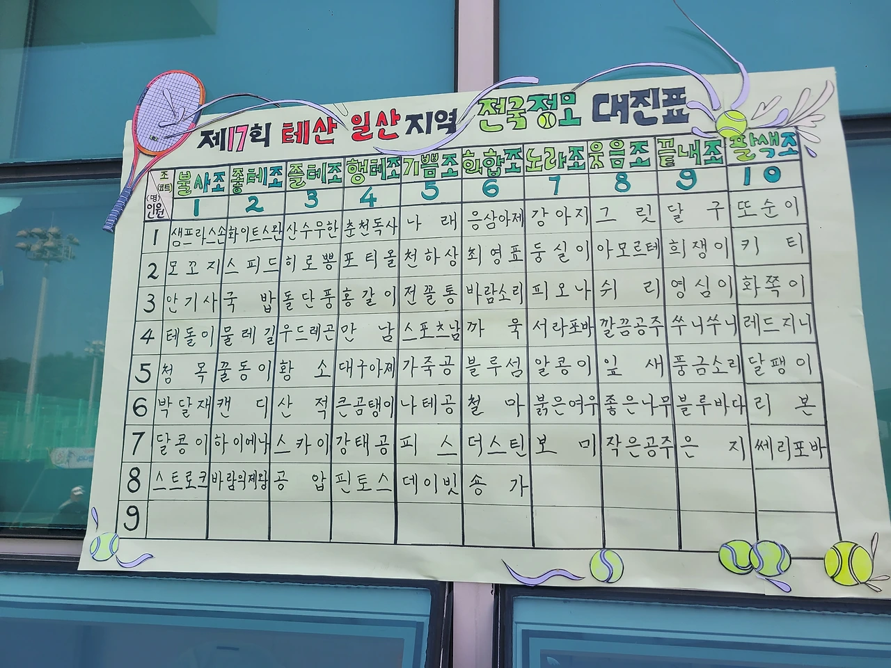 공식 경기로 10조까지 잘 짜진 게임판을 살펴보니 벌써부터 근육이 씰룩거린다. 개회식을 마치고 조 별로 배정된 코트에는 초여름의 열기 속에 노란 공을 쫓아 가쁜 숨을 몰아 쉬면서 전후좌우로 밟는 스텝들이 발바닥을 달군다.