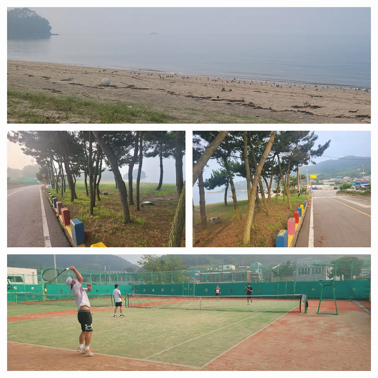 테니스장 문을 열자 잔디 코트 두 면이 작열하는 태양 아래 반긴다. 길 건너 바로 앞에는 아담한 해수욕장의 모래 해변이 발끝을 간지럽히니 이런 곳이 또 어디 있으랴 내가 테니스 투어 다닌 이래 최고의 장소가 바뀌는 순간이다.