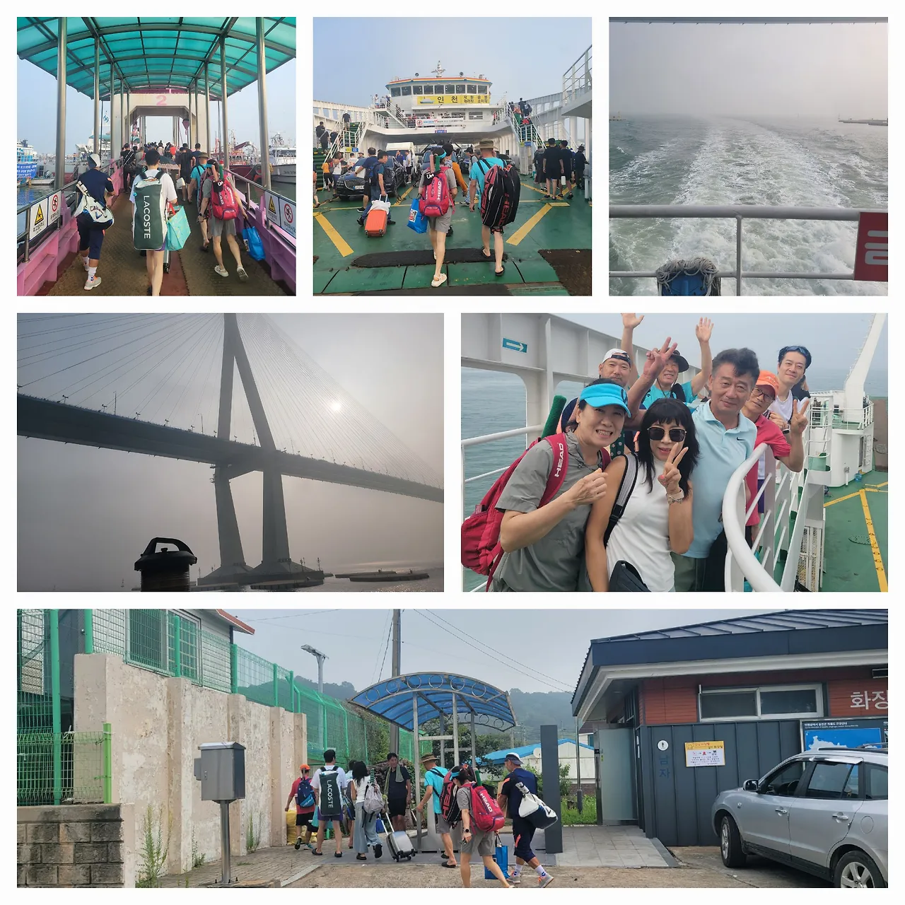올여름은 가끔씩 종잡을 수 없는 날씨였지만 오늘만큼은 바람 없는 바다는 잔잔한 호수로 배는 수면을 다림질하듯이 한 시간 남짓 스쳐 지나서 목적지인 자월도에 도착한다. 안내자는 밴드의 이규택 회원님의 지인으로서 우리들을 쌍수로 환영하여 구부러진 해안로를 따라 최종 목적지인 테니스 코트까지 안내를 한다.