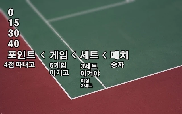 테니스 경기는 스코어 러브에서 시작하여 피프틴, 써리, 포리에서 먼저 득점을 하거나 포리 올 듀스에서 한 포인트를 득점하면 어드벤티지가 되고 다시 득점을 하면 한 게임이 마무리되면서 현재 진행 세트의 스코어의 결과를 남긴다.