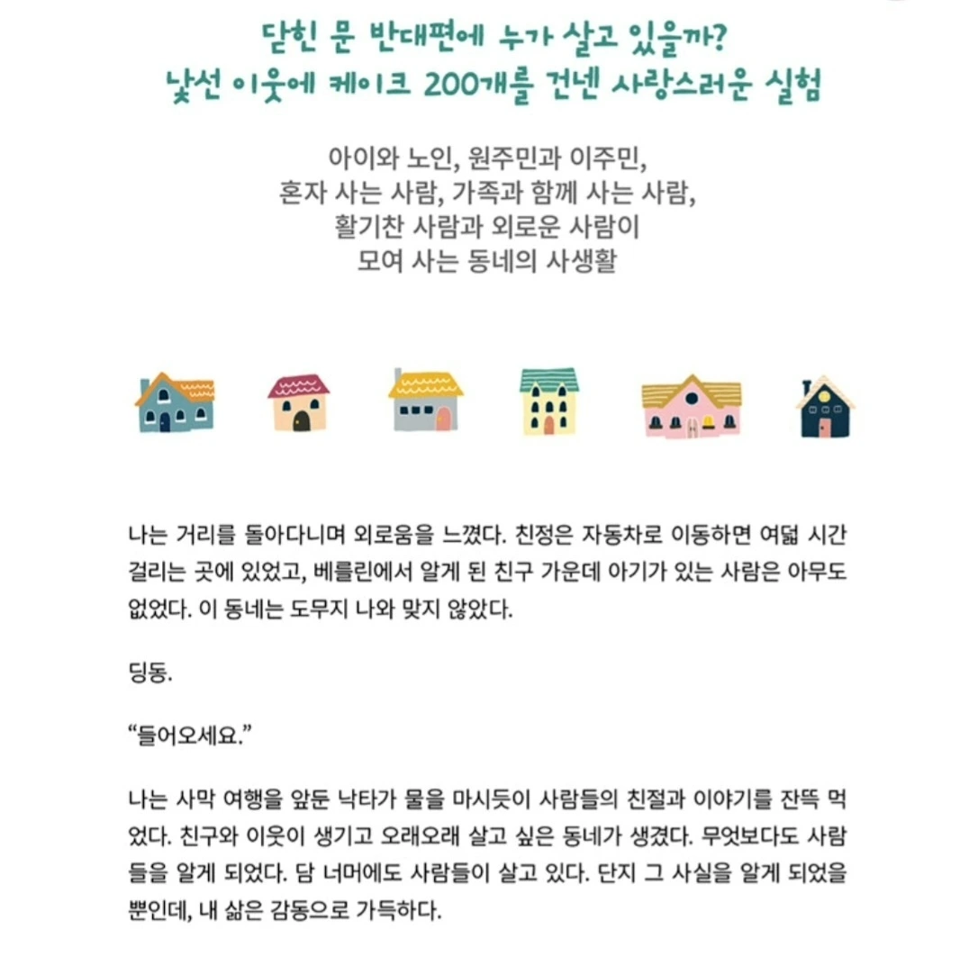 작가 자신의 실제 경험담인 책 내용을 소개하자면 다음과 같다. 지방 출신인 그녀는 결혼 후 남편을 따라 온갖 갈등과 차별에 휩싸인 대도시 베를린으로 이사를 오게 된다.(작가의 표현에 의하면) 그 갈등이란 게 지방과 도시, 동독 출신과 서독 출신, 외국인, 아파트 단지 내에서도 어느 동에 거주하냐에 따라 골이 깊기만 하다. 나로선 이해가 잘 되지 않지만 심지어 임신 중이거나 어린 아기를 데리고 다니는 여자들은 심한 혐오와 더불어 일종의 공격성까지 느끼기도 한다. 육아 휴직 중인 작가는 더 이상 그런 분위기에 순응하고 살 순 없다 생각하여 먼저 사람들에게 다가서기로 결심한다. 그렇게 200일 동안 200개의 케이크를 만들어 200 가구를 방문하는 이웃집 방문 프로젝트를 세우게 된다. 결코 아무나 할 수 없는 다소 무모한 도전을 시작한 이후 작가는 120일 동안 2893번의 초인종을 누르고 130 집 방문에 성공하여 200명의 소중한 이웃을 알게 된다.