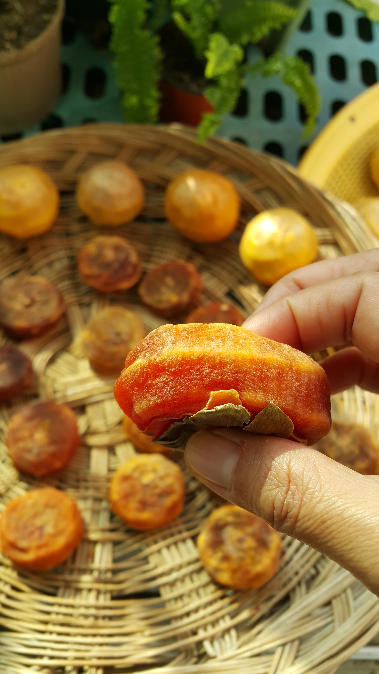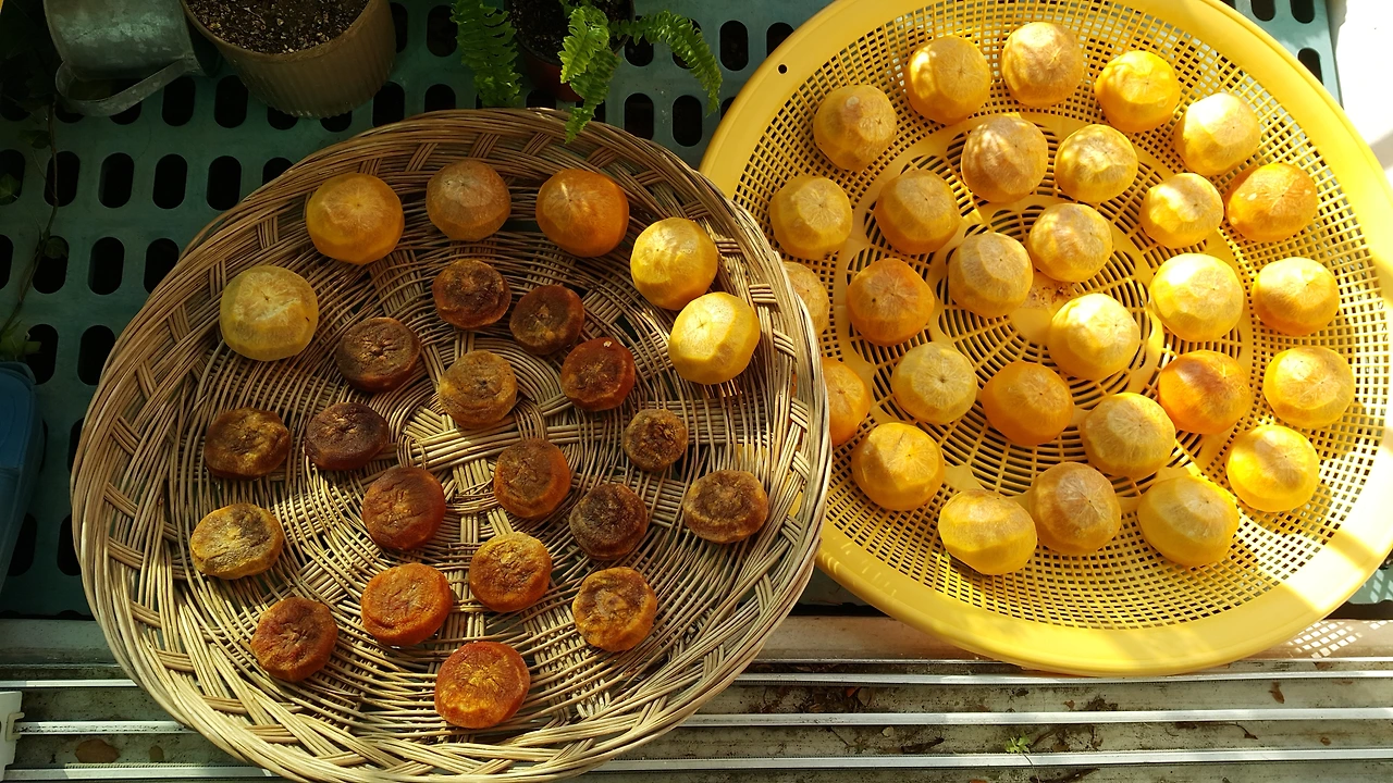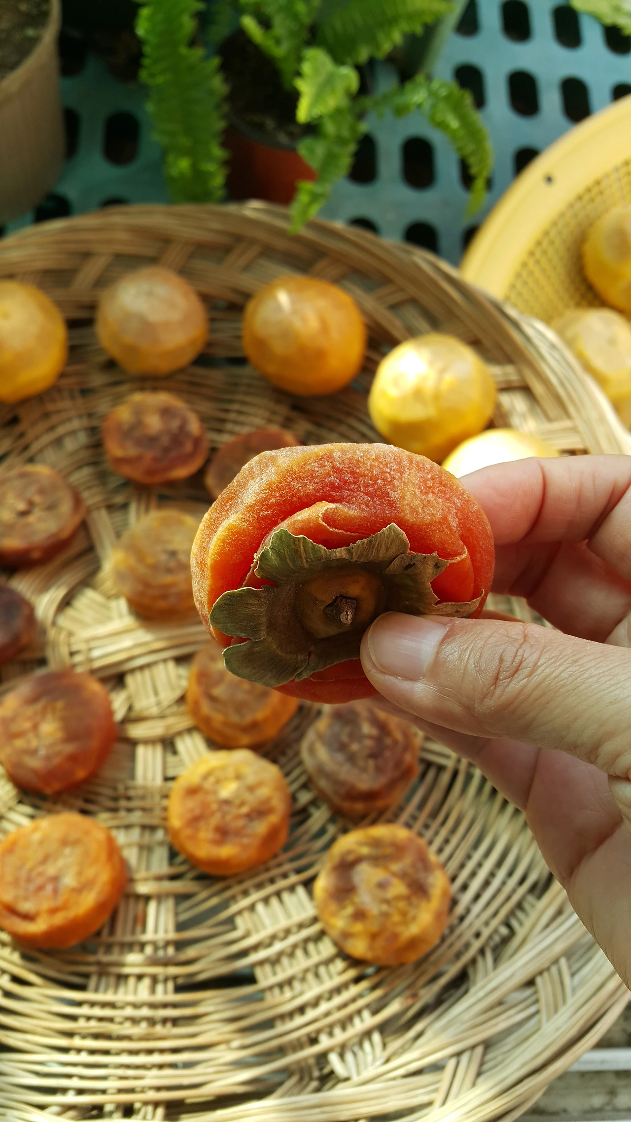 대봉은 부피감이 있어 실에 매다는 건 몰라도 채반에 말리기엔 좀 부적합하다. 쉽게 구입할 수 있는 저렴하고 납작한 단감이 건조에 더 용이하다. 크기가 큰 단감보다 중간 정도의 크기의 단감을 선택하여 깎은 후 채반에 널어 말리면 끝이다. 그 후 바닥에 닿는 부분에 바람이 안 통하여 곰팡이가 생길 수 있으니 하루에 한두 번 위, 아래를 뒤집어 준다. 겉면이 어느 정도 말라 지 속의 여린 것을 보호할 수 있을 만큼 되면 꾹 눌러 납작한 찹쌀떡 모양을 만들어 준다. 겉은 말라 있어도 속은 물컹거리기에 너무 꾹 누르면 터질 수 있으니 겉면이 터지지 않을 만큼의 힘만 가한다. 겉만 잘 마르면 속에서 무슨 일이 일어나도 그해 수확은 어느 정도 보장받는다. 그리고 다시 하루에 한두 번 정도 위, 아래를 뒤집어 말려준다.
