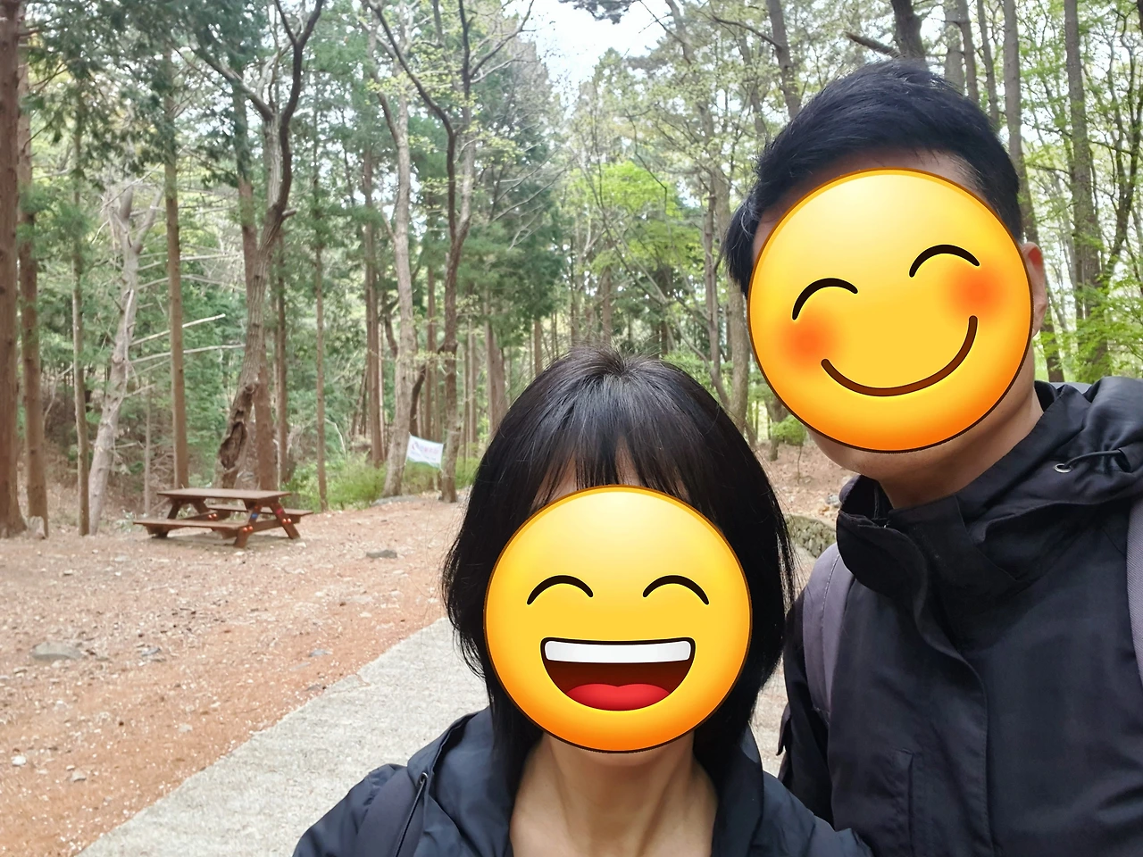 오르막길보다 내리막길이 더 위험하고 힘든 것 같다. 무릎이 슬슬 아파오자 아무도 없는 오솔길 한쪽에 둘이 나란히 자리 잡고 철퍼덕 앉는다. 슬슬 장난기가 발동하여 과일을 먹는 남편 얼굴을 바라보며 짓궂은 질문을 한다.