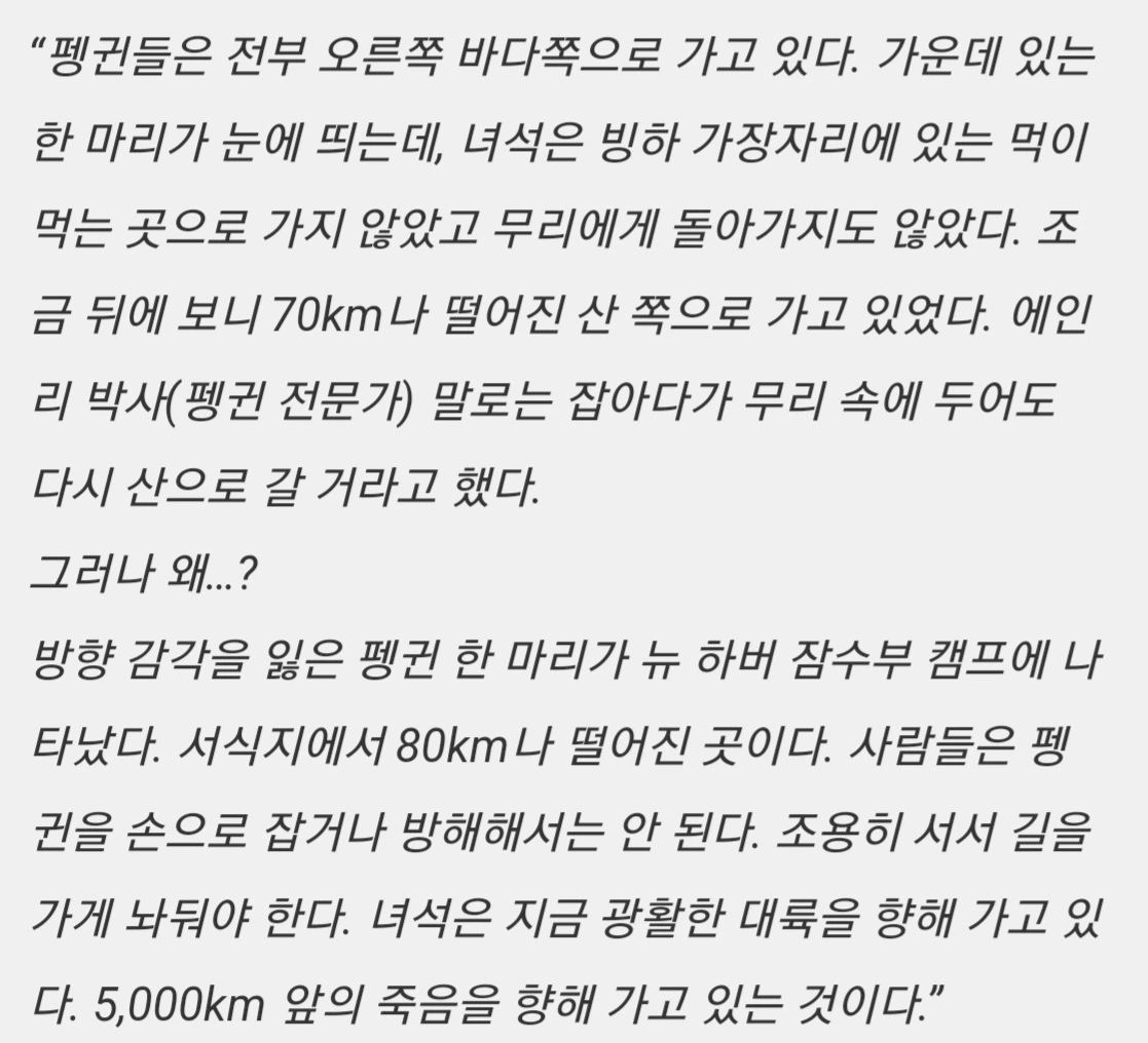 한 펭귄 연구가가 말하길, 더러 방향감각을 잃고 무리와 떨어져 혼자서 어디론가 향하는 펭귄이 있다고 한다. 이 펭귄은 다시 무리에 돌려놓아도 다시금 자신의 길을 찾아 떠난단다. 인간은 그저 지켜볼 수는 있지만 그 앞을 막아서면 안 된다고 한다.