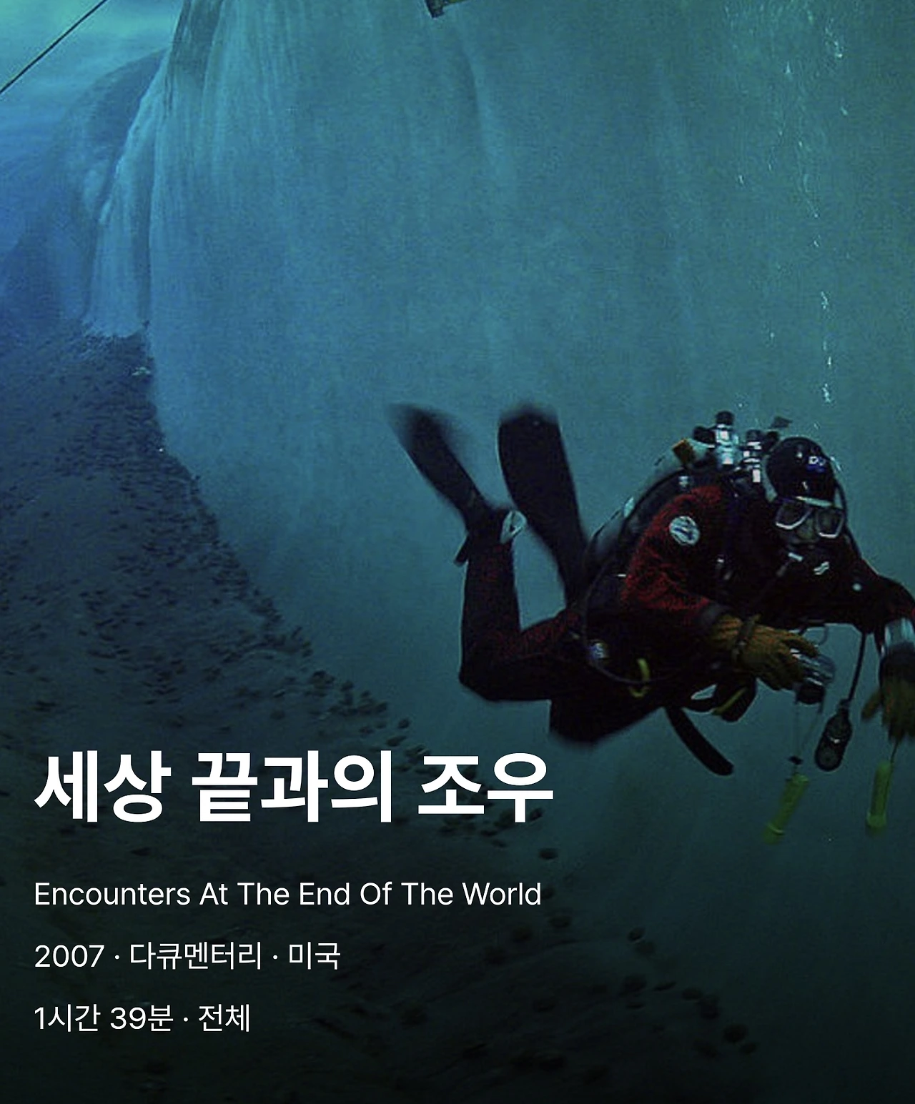 남극에 대한 많은 연구가 있지만, 남극에 살고 있는 사람들에 대한 연구는 별로 없을 것이다. <세상 끝과의 조우>는 각종 연구가들 뿐만 아니라 여행가나 인권운동가 등 남극으로 모여든 각양각색의 사람들을 찾아간다. 원래는 철학교수였다는 운전기사, 노래하고 춤추며 사람들과 즐거움을 공유하는 예술가, 추운 극지방에서 꽃을 피우는 원예연구가 등, 남극은 그들에게 하나의 도전이며 안식이고, 피난처이며 동시에 희망의 장소이다.