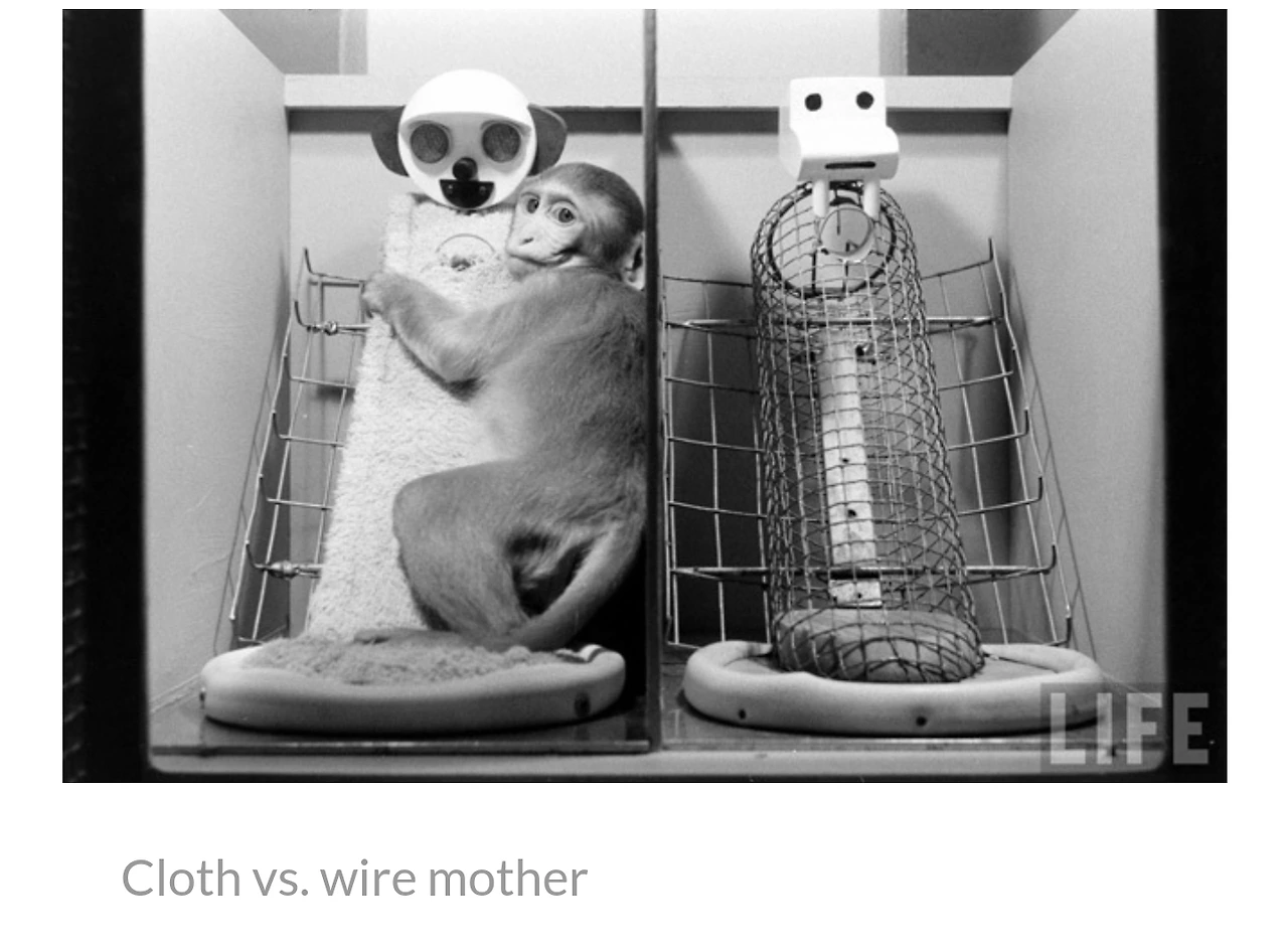 필자가 스무 살 무렵 대학교양수업에서 보았던 한 영상은 모든 생명체 (최소한 젖을 빠는 포유류들)에 대한 생각을 통째로 바꾸어 놓았다. 해리 할로(Harry Harlow)의 애착 심리학 실험으로 알려진 영상은 한 어린 원숭이를 보여준다. 그 앞에는 두 개의 가짜 어미 인형이 있다. 한쪽의 어미는 차가운 금속이지만 젖이 나오고 다른 쪽의 어미는 부드러운 천으로 이루어져 있지만 젖이 나오지 않는다. 실험의 결과는 놀라웠다. 새끼 원숭이는 젖이 나오는 금속어미 대신 천으로 만든 어미와 애착관계를 형성했다. 배가 고파지면 금속어미의 젖을 빨고는 배를 채우면 얼른 천으로 만든 어미에게 달려가 매달리고 기어 다니고 살짝 깨물며 몇 시간씩 보내는 것이다.