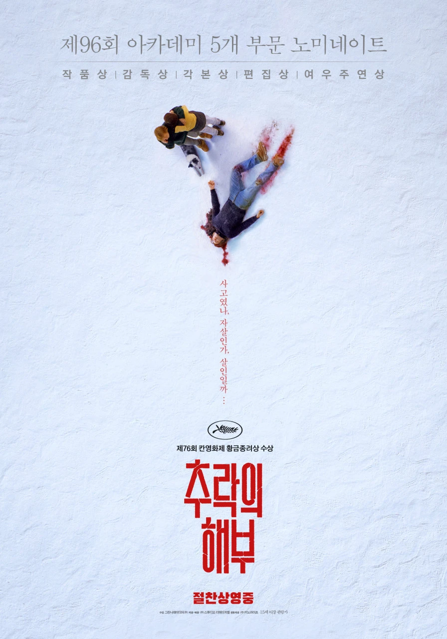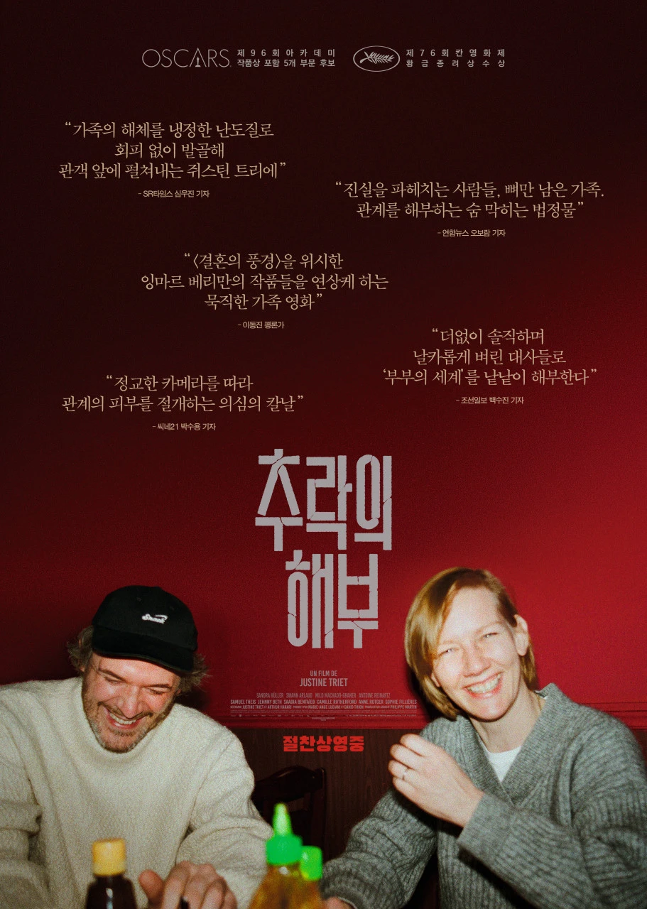 우리는 결국 모두 유약하고 위태로운 존재이다. 맞닿은 타인의 온기를 본능처럼 원하는. 법정의 결과를 듣고 집으로 돌아온 산드라는 죽음 같은 잠에 빠져든다. 그녀 옆에는 아들을 지켜주는 개 스눕이 있다.