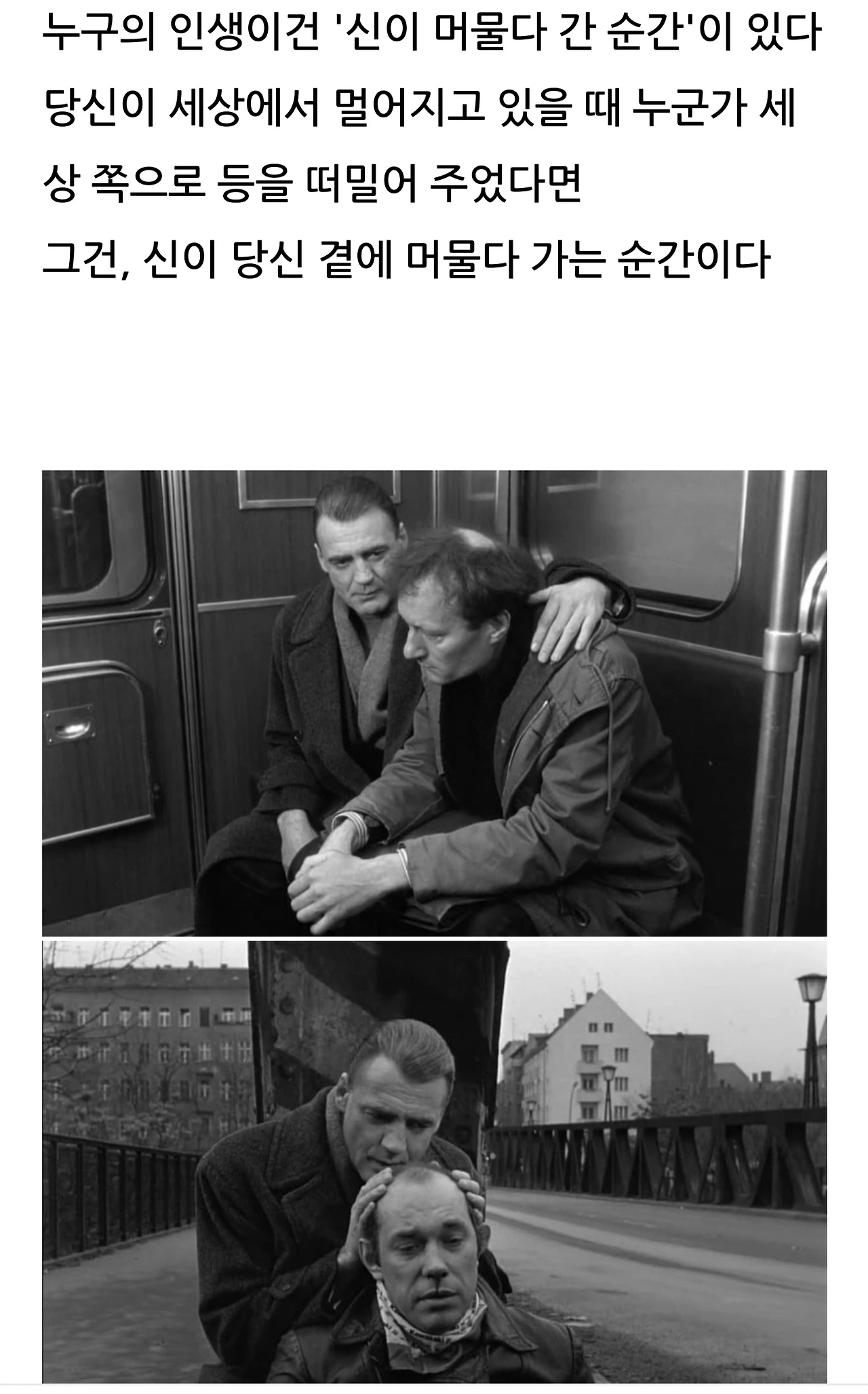 전쟁 기념 교회 탑 위의 두 천사, 다미엘과 카시엘, 그들이 하늘에서 내려다본 도시의 빌딩 숲과 거리 풍경, 바쁜 인파 속에서 어린아이들 시선으로 지상에서 올려다본 구름 낀 하늘이 몽타주 기법으로 교차 편집되는 장면은 시선과 이야기, 그리고 정서의 관계를 상기시킨다. 그리고 다미엘이 타인의 마음을 읽듯 카메라 또한 대상과의 거리를 통해 정서를 표현해 낼 수 있음을 말해준다.