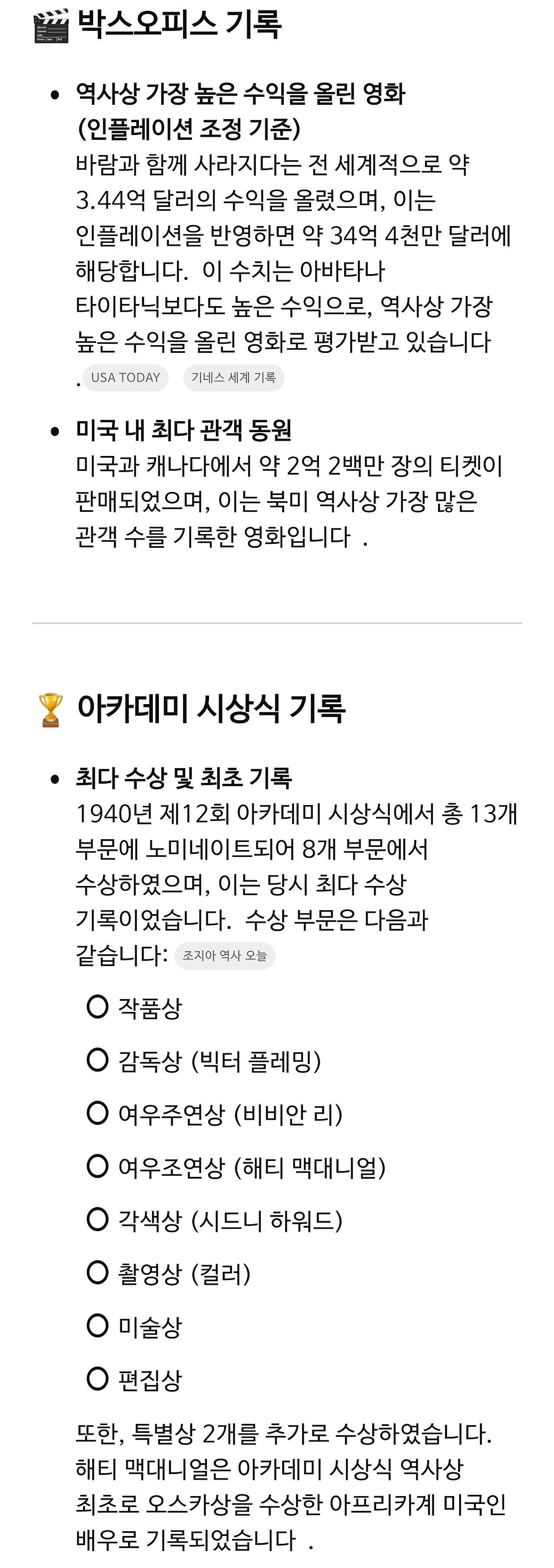 이 영화의 규모는 당시 평균영화보다 훨씬 컸으며 특수효과 역시 눈에 뜨게 정교하다. 화면합성장면도 시대를 고려하면 크게 어색하지 않으며 테크니 컬러(technicolor)로 촬영된 화면색상은 지금 보아도 상당히 생생하다. 제작비만 약 390만 달러(1939년 기준)가 투입되어 당시로서 엄청난 대작이었다. 흥행성적 또한 경이로웠다. 개봉 당시 북미에서만 약 3900만 달러를 벌어들였으며 이후 재개봉등을 포함해 인플레이션을 감안하면 미국 역사상 가장 많은 수익을 올린 영화로 평가받는다.