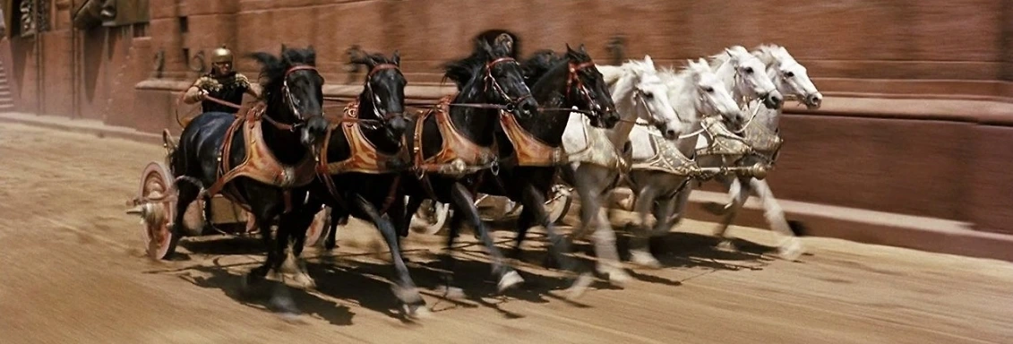 이 영화의 백미, 그리고 전설로 남은 장면은 누가 뭐래도 전차 경주이다. 4마리의 말이 이끄는 전차를 타고 트랙을 미친 듯한 속도로 질주하는 장면은 단순한 볼거리를 넘어 스크린을 뚫고 관객의 심장을 쥐고 흔드는 듯한 전율을 선사한다. 고대 로마의 광활한 경기장의 열기와 함성은 마치 필름 너머로 솟구쳐 오는 듯하다. 당시 할리우드 영화의 스케일이 어디까지 확장될 수 있는지를 실감케 하는 이 장면은 영화 전체를 집약하는 상징이자 기술적 정점이기도 하다.